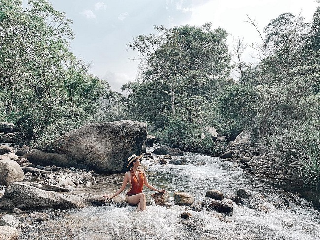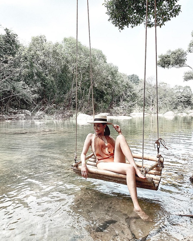 Trong chuyến du lịch đến Nha Trang gần đây, siêu mẫu Lan Khuê cũng mau chóng “khoe mình” trong thiết kế đồ bơi một mảnh giữa núi rừng hoang sơ