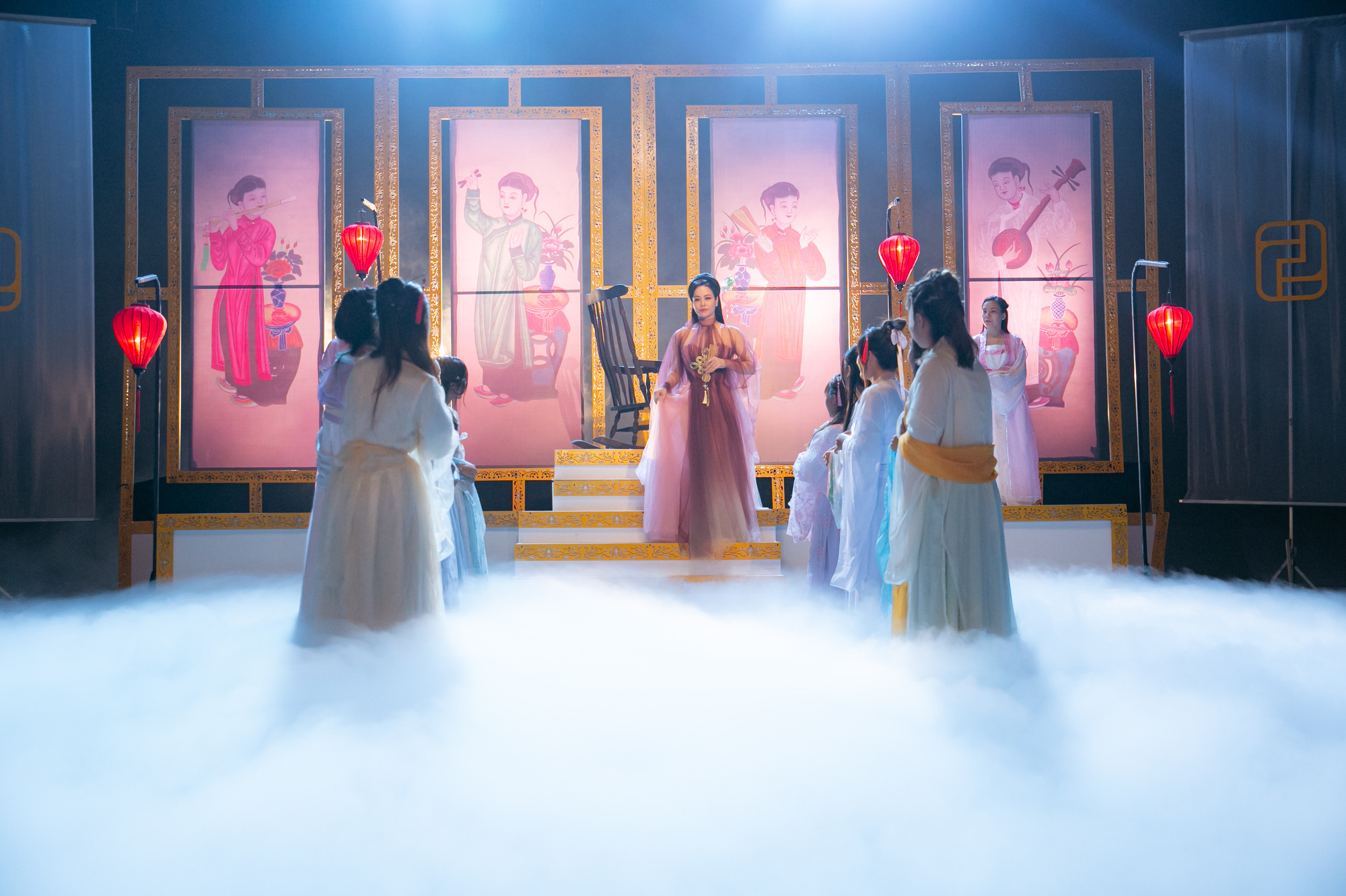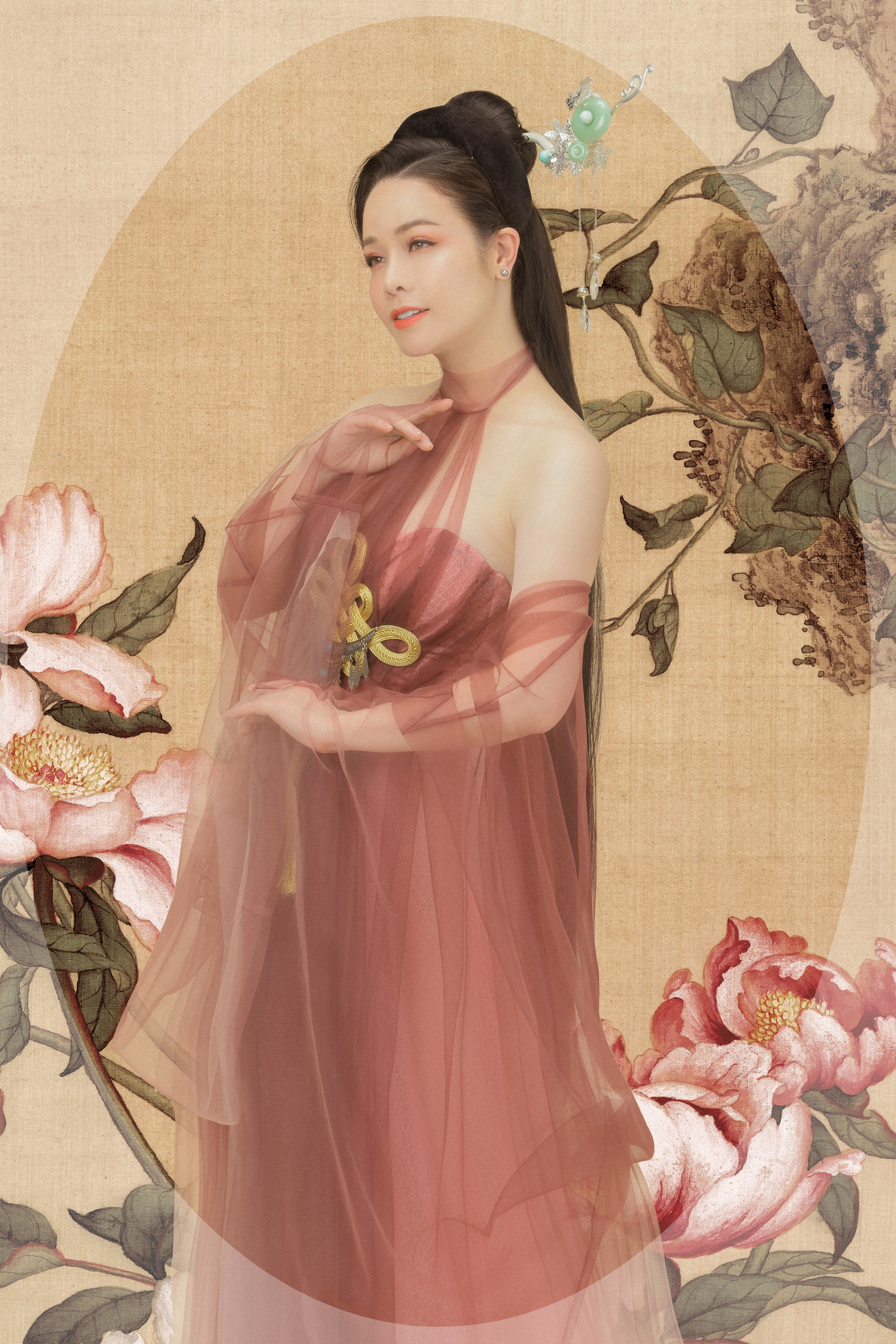 “Mình đã nghiên cứu trang dân gian Hàng Trống, bộ tranh Tố nữ để làm 12 bộ váy cho Nhật Kim Anh. Ngoài váy áo còn có nhiều phụ kiện phụ trợ như mấn, trâm cài.