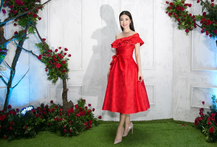Hoa hậu đất Bắc rực rỡ với váy dạ hội đỏ thiết kế lệch vai và chít eo rất gợi cảm đi dự sự kiện tại TP HCM.