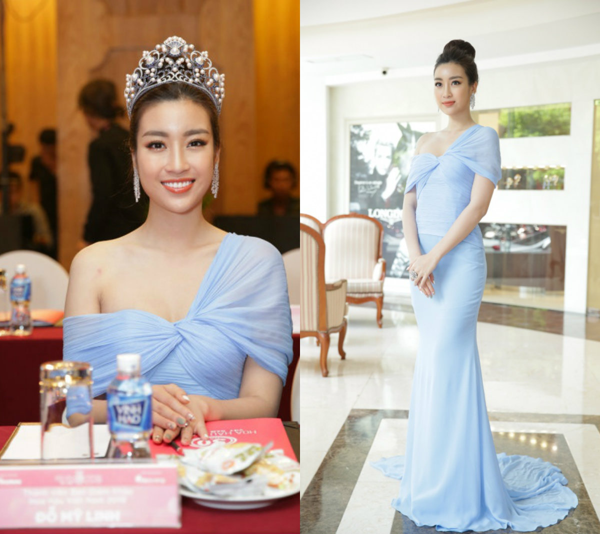 Bạn sẽ bất ngờ trước tủ đồ toàn những kiểu váy lệch vai của người đẹp họ Đỗ. Mới đây nhất khi tham gia sự kiện họp báo HHVN 2018 diễn ra hôm 12/6, chân dài tiếp tục với phong cách sang trọng, thanh lịch. Và váy áo kiểu “nửa kín nửa hở” ở bờ vai tiếp tục được cô lựa chọn. Phần cổ áo lệch một bên vai giúp Đỗ Mỹ Linh khoe khéo xương quai xanh nhỏ nhắn và quyến rũ.