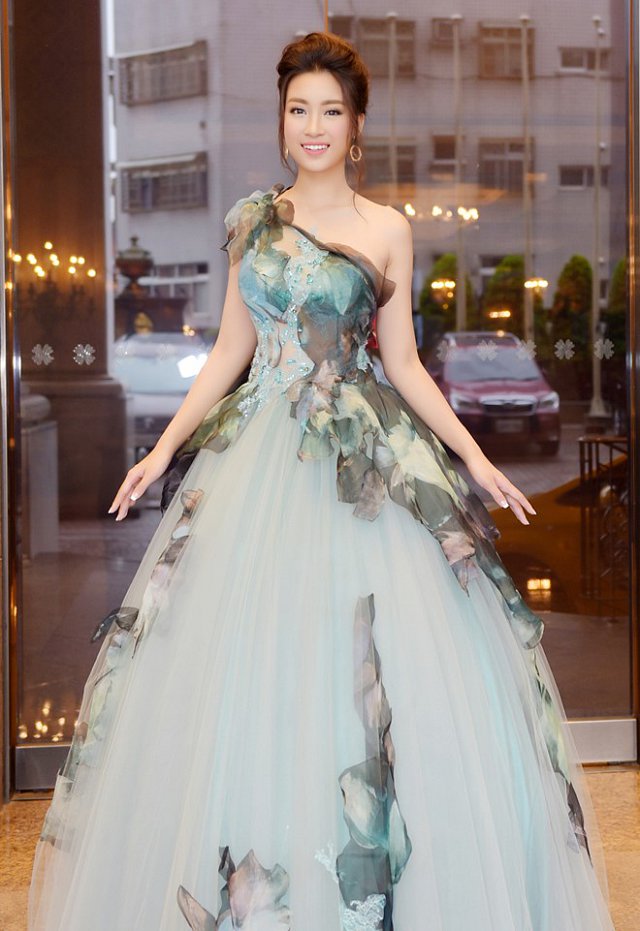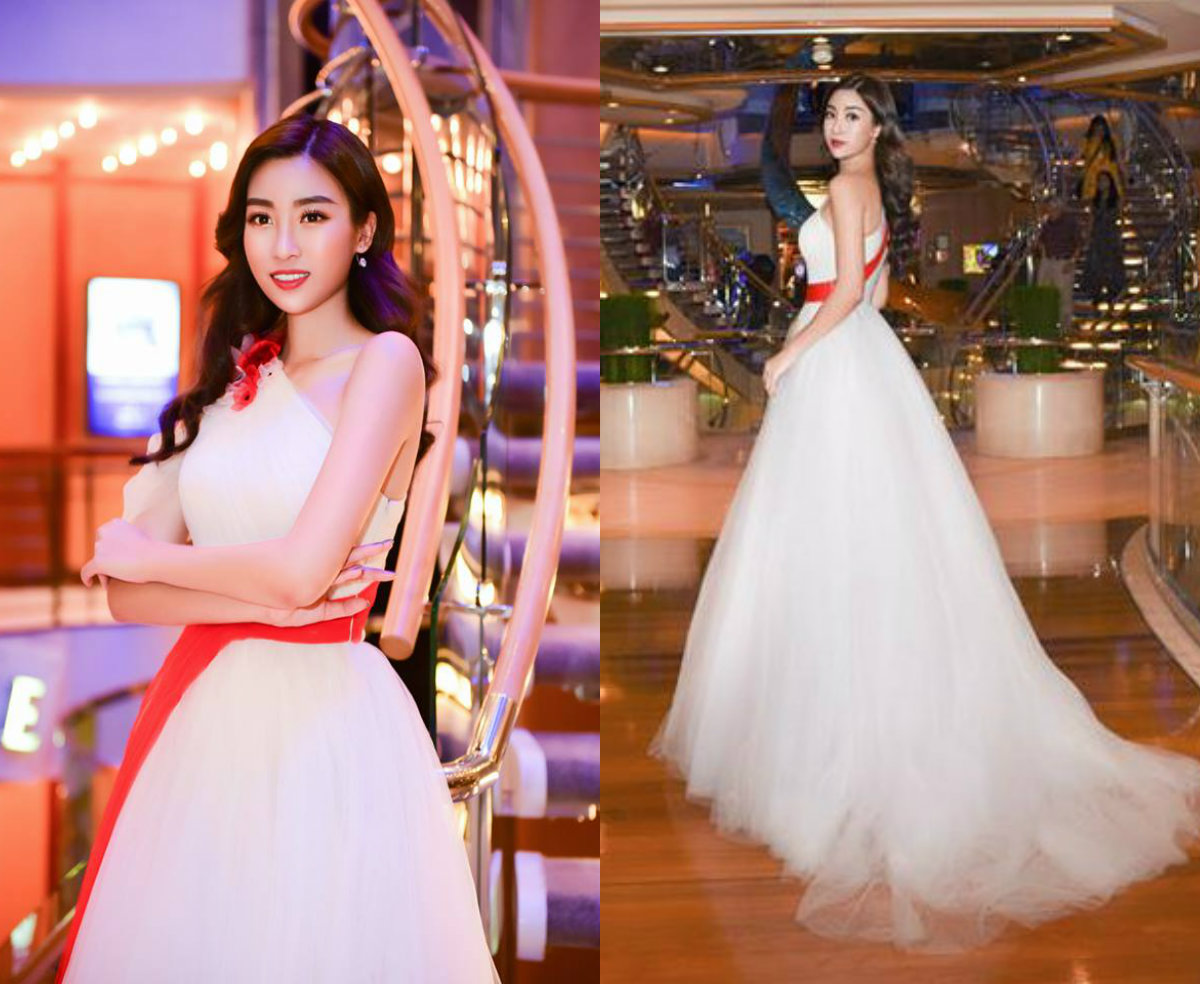 Trước đó vài ngày khi tham sự kiện trên du thuyền 5 sao, Đỗ Mỹ Linh lại “gây thương nhớ” với một bộ cánh bồng bềnh tựa một nàng công chúa. Thiết kế lệch vai của nhà mốt Lê Thanh Hòa đã thực sự làm thăng hoa vẻ đẹp của chân dài sinh năm 1996.