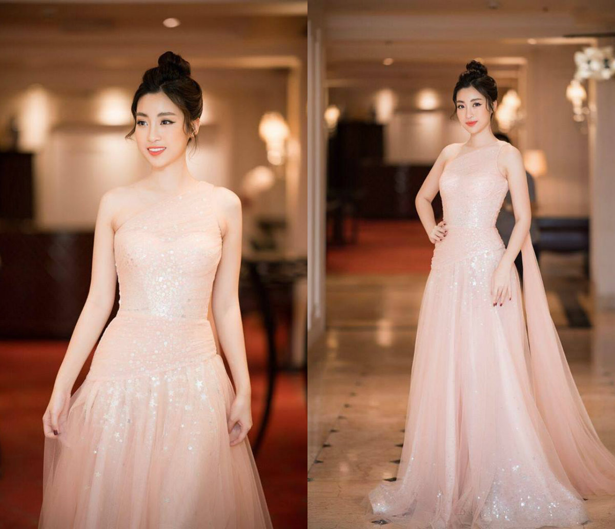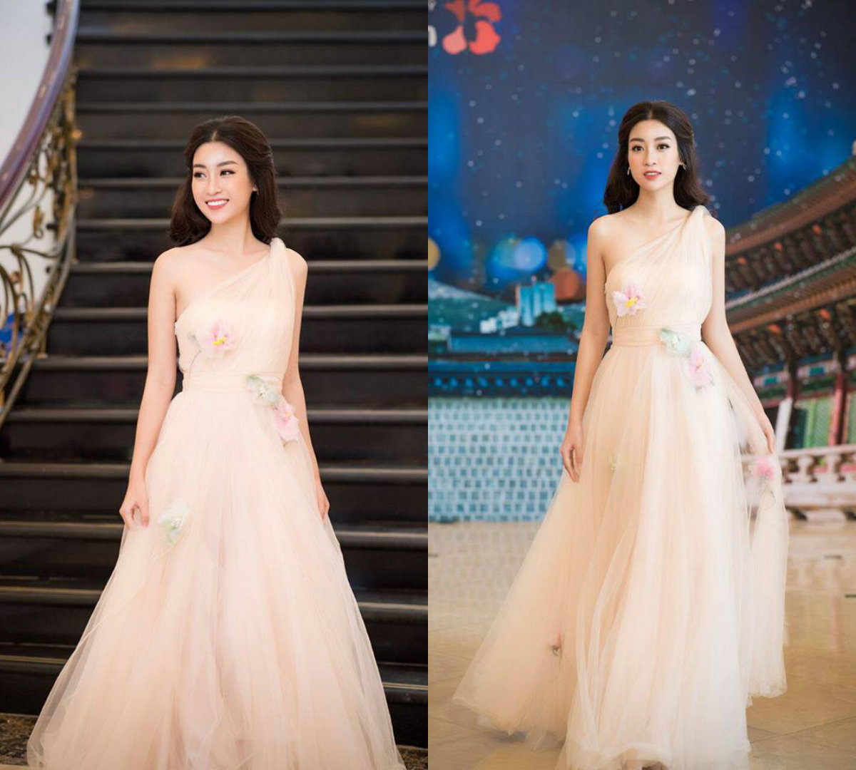 Một chiếc váy đính kết lệch vai kèm theo một chút phụ kiện nhẹ nhàng khiến cho Hoa hậu họ Đỗ trẻ trung, rạng rỡ.