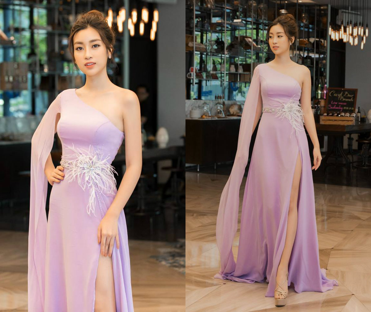 Với một Hoa hậu không quá chuộng phong cách hở bạo nhưng vẫn muốn có sự gợi cảm thì đầm lệch vai là lựa chọn tuyệt vời của chân dài Hà thành. Kiểu váy này dường như phù hợp với tính chất nhiều sự kiện. Bởi nó không quá hở hang, song vẫn tạo cho người mặc sự nổi bật vốn có.