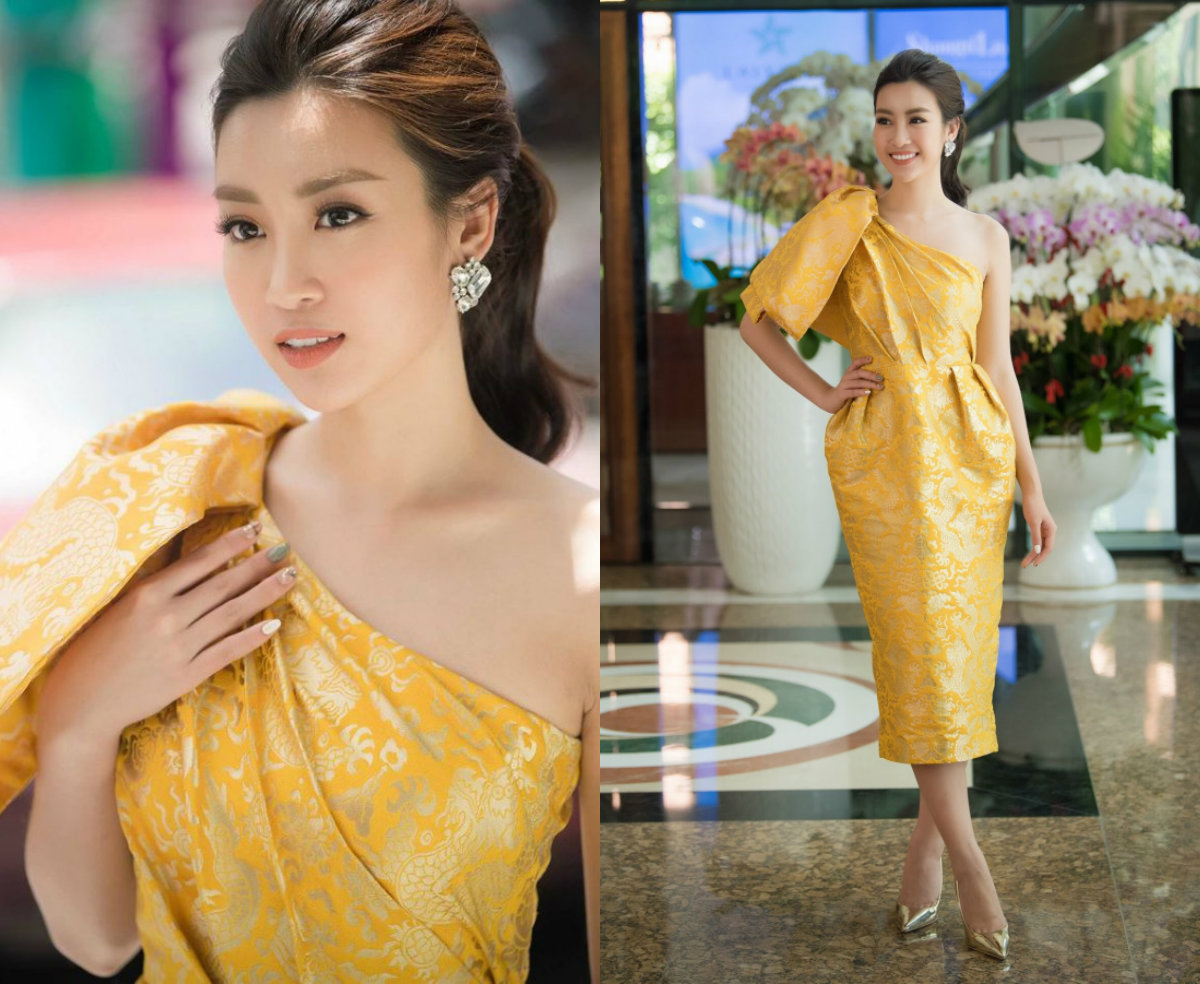 Để không bị nhàm chán, Đỗ Mỹ Linh tạo sự mới lạ trong các phom dáng cùng màu sắc ấn tượng. Chiếc váy màu vàng chanh này là một ví dụ điển hình. Thay vì chỉ có đường xẻ đùi cô kết hợp thêm phần tà khiến trang phục trở nên lộng lẫy đồng thời tạo sự khác biệt.