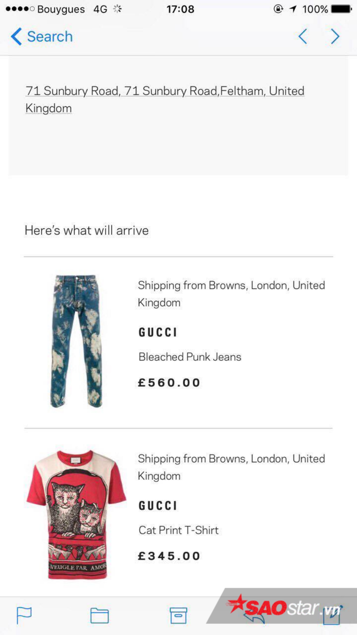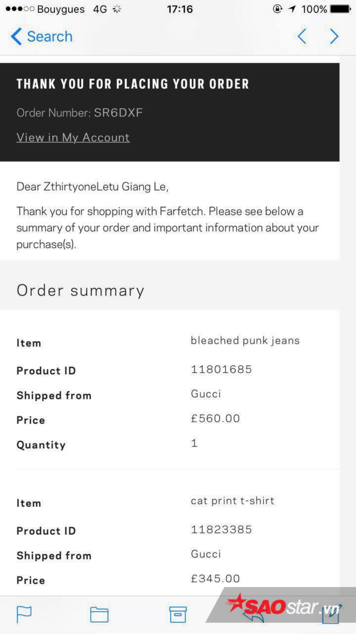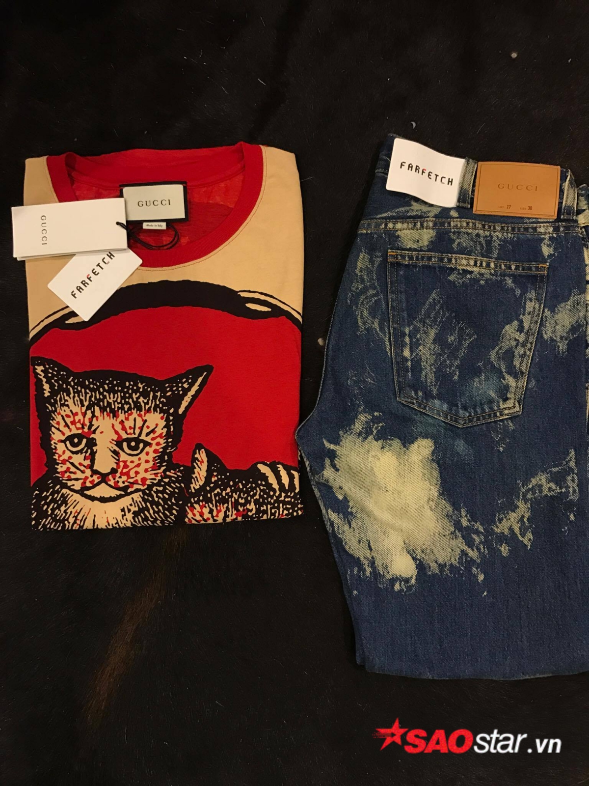 Không những vậy, khi nhận được hàng, Decao còn cẩn thận chụp lại set đồ còn nguyên mác của thương hiệu Gucci cũng như nơi bán hàng Farfetche: