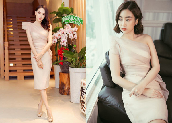 Hương Giang quả thực rất xuất sắc với mẫu váy lệch vai tông hồng nhạt ngọt ngào này nhưng soi xét một cách tỉ mỉ, cô vì để tóc dài nên kém thu hút hơn Đỗ Mỹ Linh một chút.