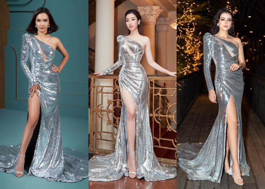 Mẫu váy đuôi cá của NTK Linh San đều hợp với sắc vóc của Đỗ Mỹ Linh lẫn Hương Giang.