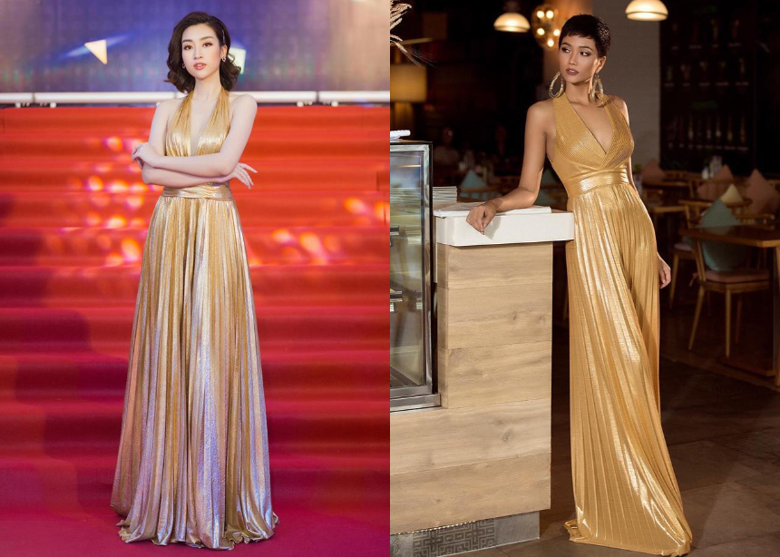 Thật khó để rời mắt khỏi Đỗ Mỹ Linh và H'Hen Niê khi cả hai diện lên mình chiếc đầm vàng ánh kim lấp lánh, giúp tôn lên trọn vẹn mọi lợi thế làn da, khuôn ngực đầy đặn, vòng eo con kiến.