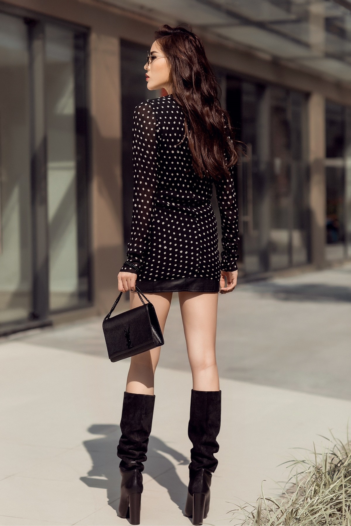 Kỳ Duyên diện váy chấm bi bèo nhún của thương hiệu đến từ nước Pháp Saint Laurent kết hợp cùng túi xách và boot cùng thương hiệu. Với đôi chân thon dài cùng thần thái đầy khí chất, Hoa hậu 22 tuổi vô cùng nổi bật.