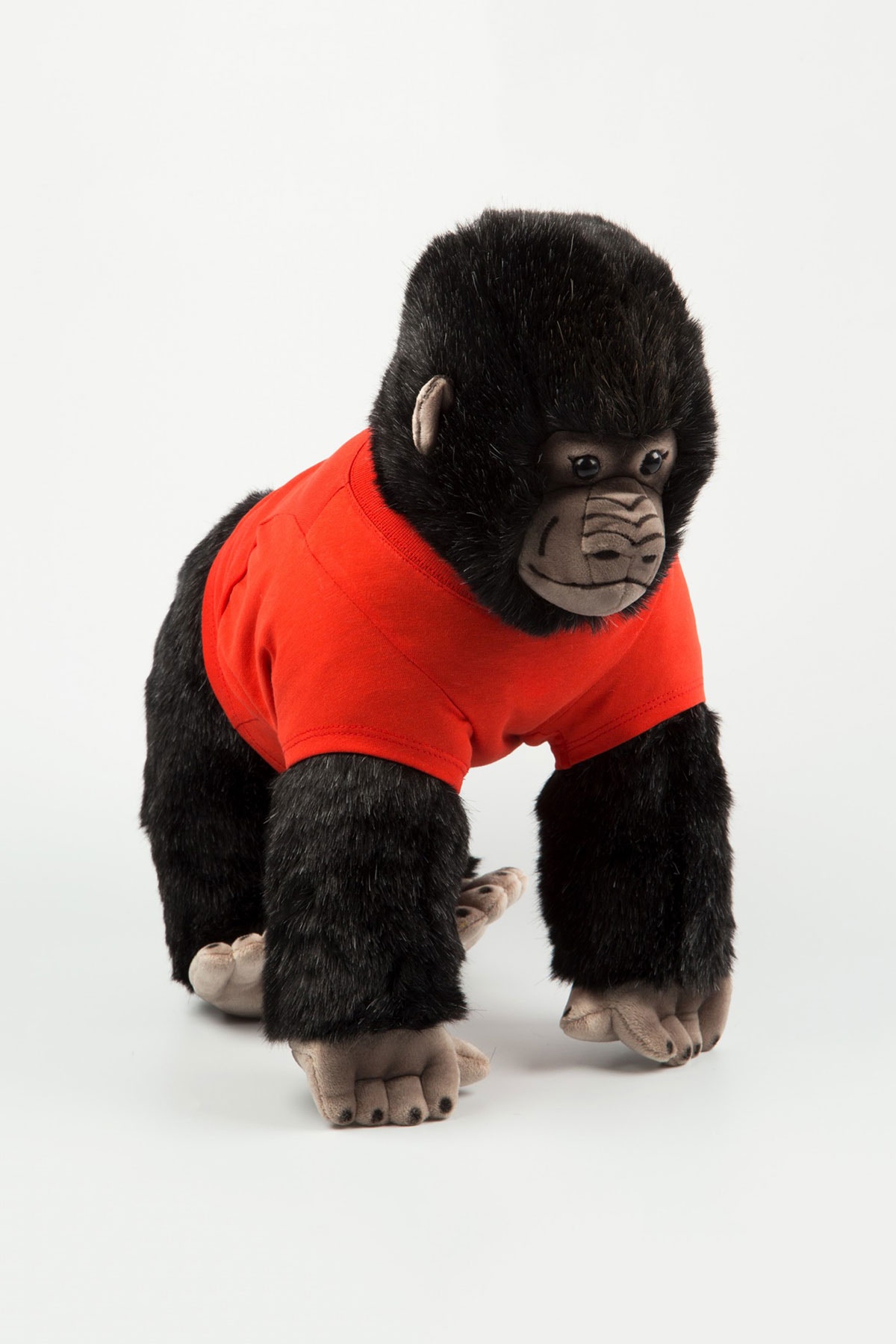 Mẫu gấu bông Gorilla có kích thước lớn có tên Goran được mặc áo thun màu đỏ mang logo Balenciaga phía sau.