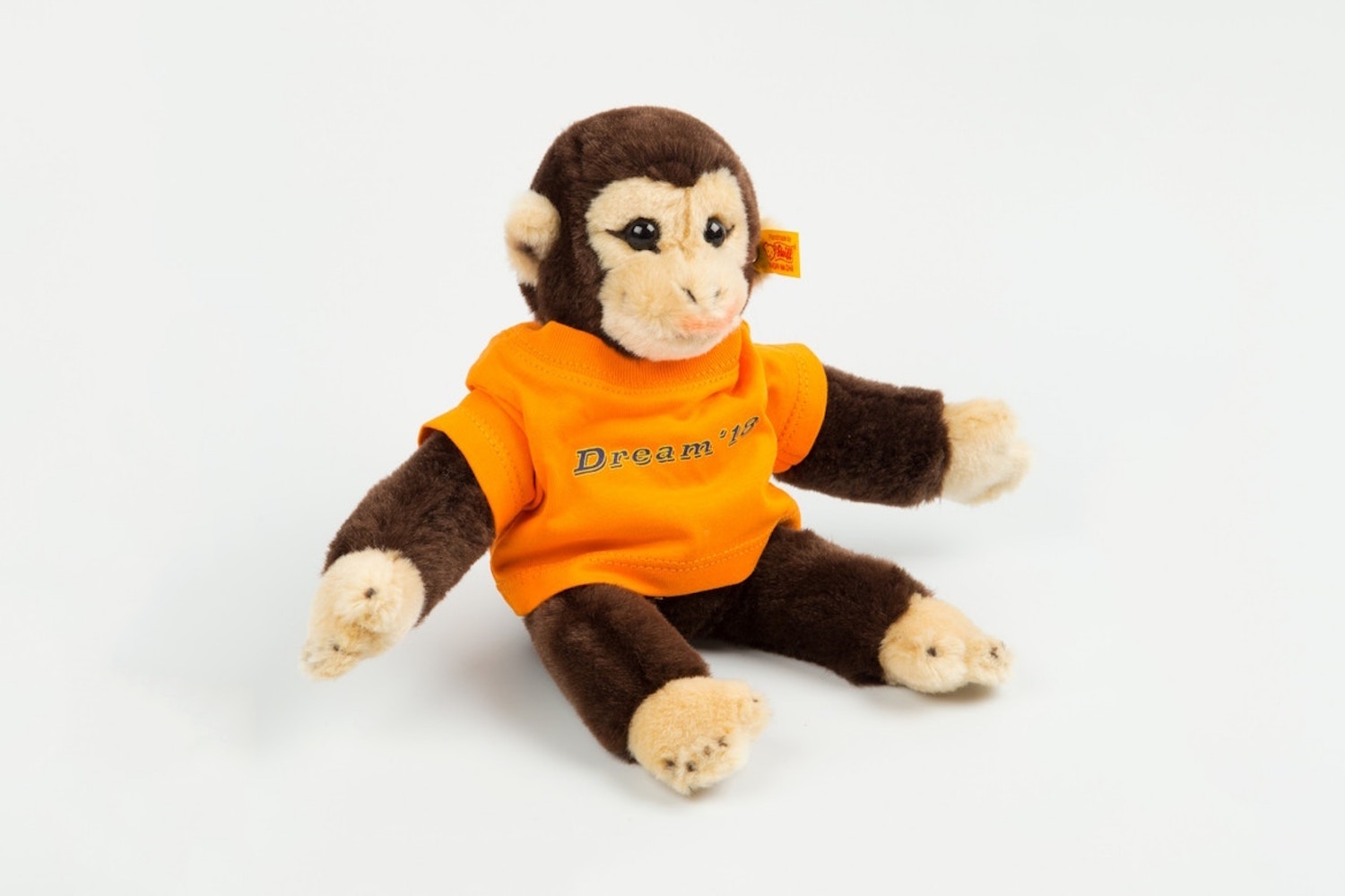 Chú khỉ với chiếc áo cam nổi bật cùng dòng chữ Dream'18.