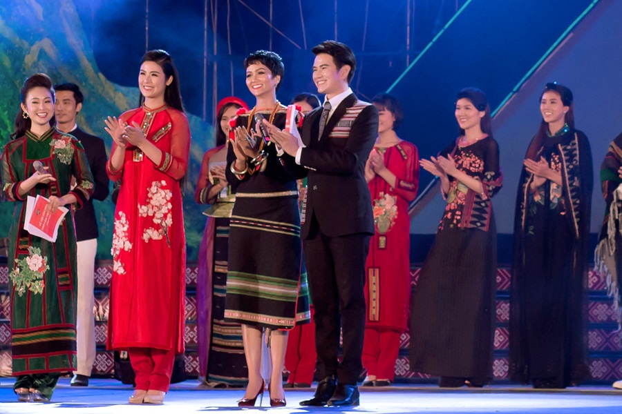 Hoa hậu H'hen Niê hội ngộ những người bạn quen biết là hoa hậu Ngọc Hân và MC Vũ Mạnh Cường tại Lễ hội Thổ Cẩm Việt Nam.