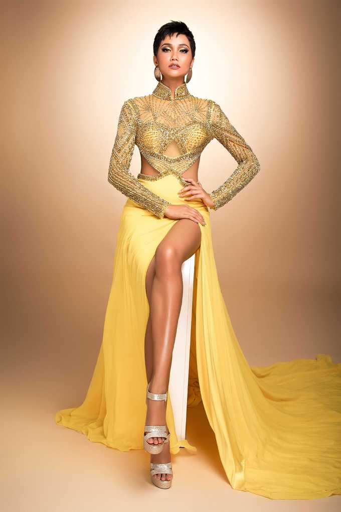 Nhờ có làn da nâu đen bóng, chân dài Ê Đê chẳng ngán những sắc phục chỉ nhìn thôi là chói cả mắt. Trong đó sắc vàng được cho là một trong những màu sắc ruột của H'hen Niê. Không thể phủ nhận rằng, dưới lớp áo màu vàng thì làn da nâu đặc trưng của cô lại càng được tôn lên triệt để. Đó cũng chính là lý do H'Hen Niê “sủng ái” màu sắc này ở khắp muôn nơi.