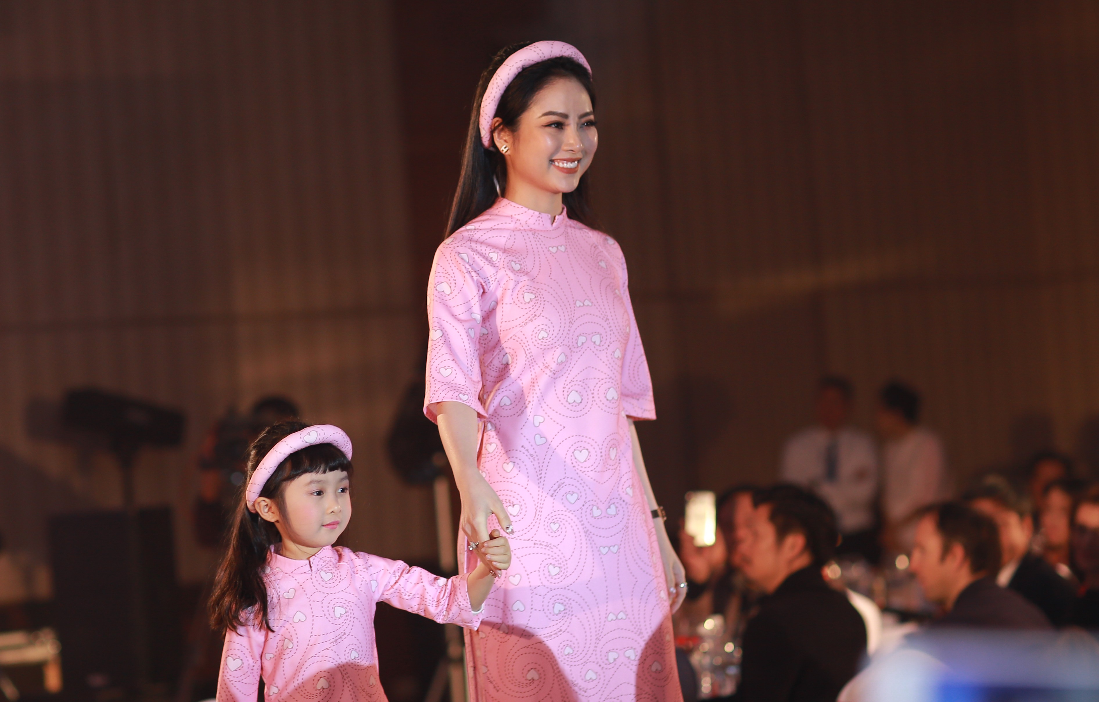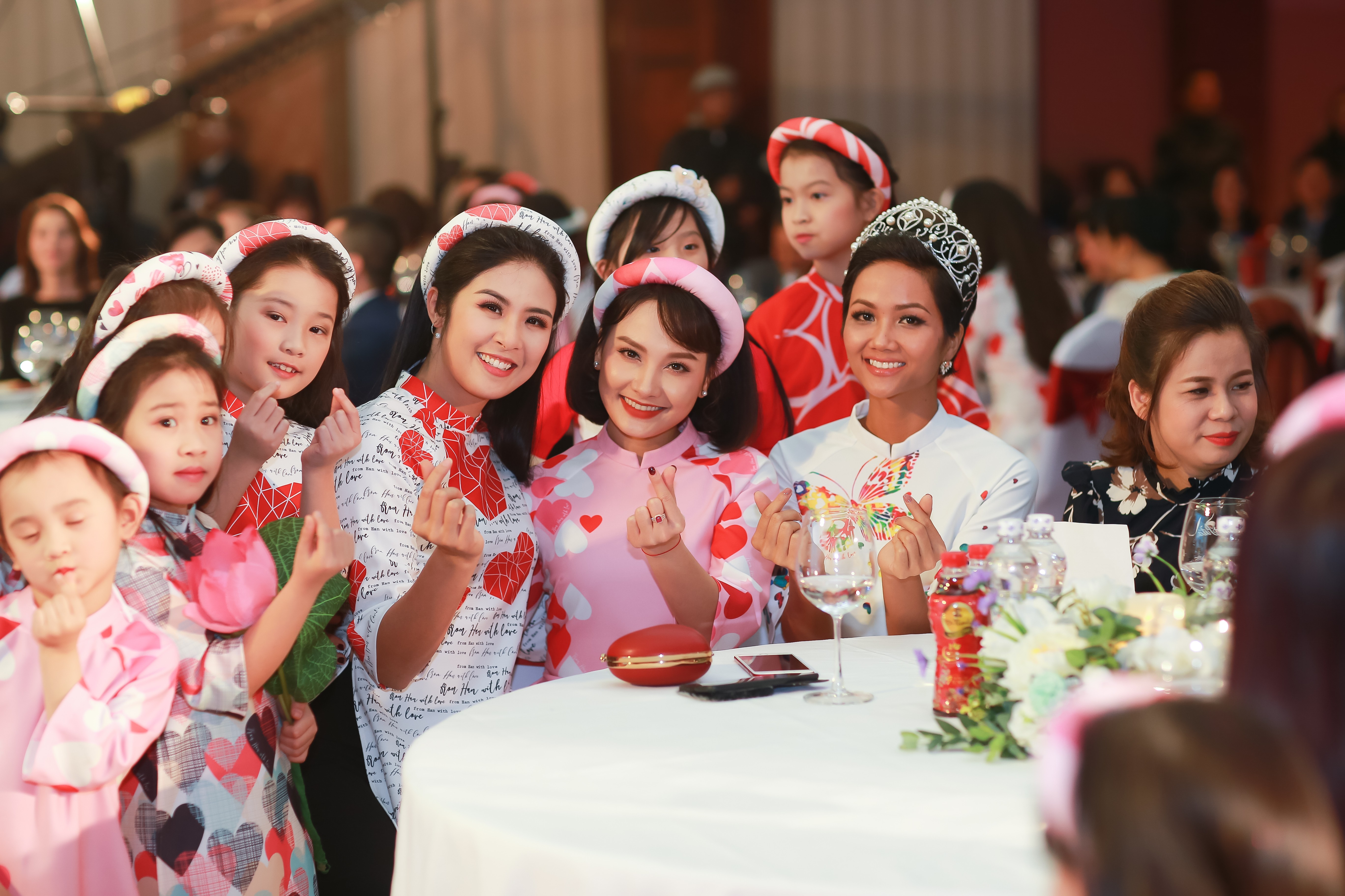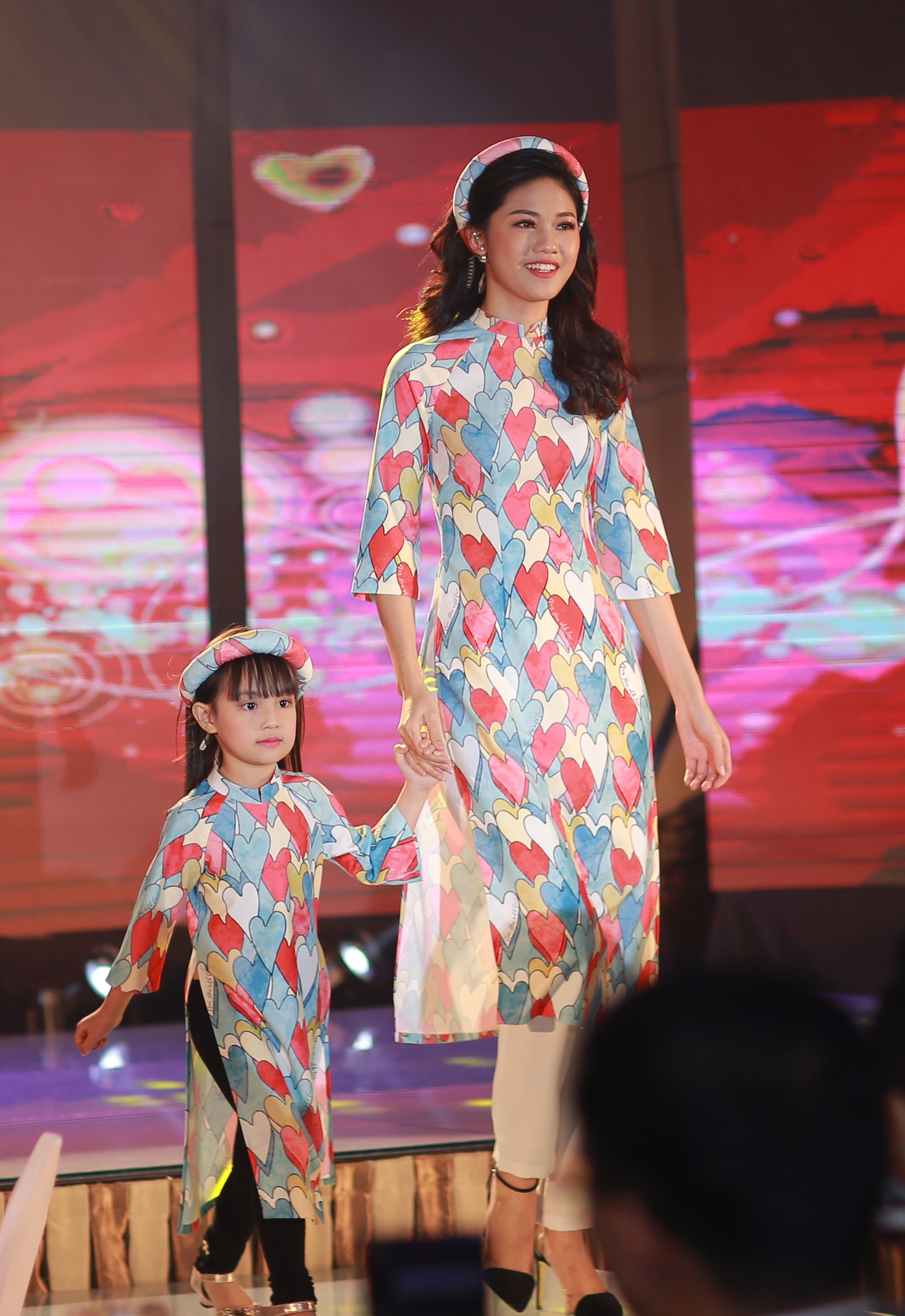 H'Hen Niê diện áo dài họa tiết trái tim, tự tin trình diễn catwalk cùng với người mẫu nhí trong chương trình.