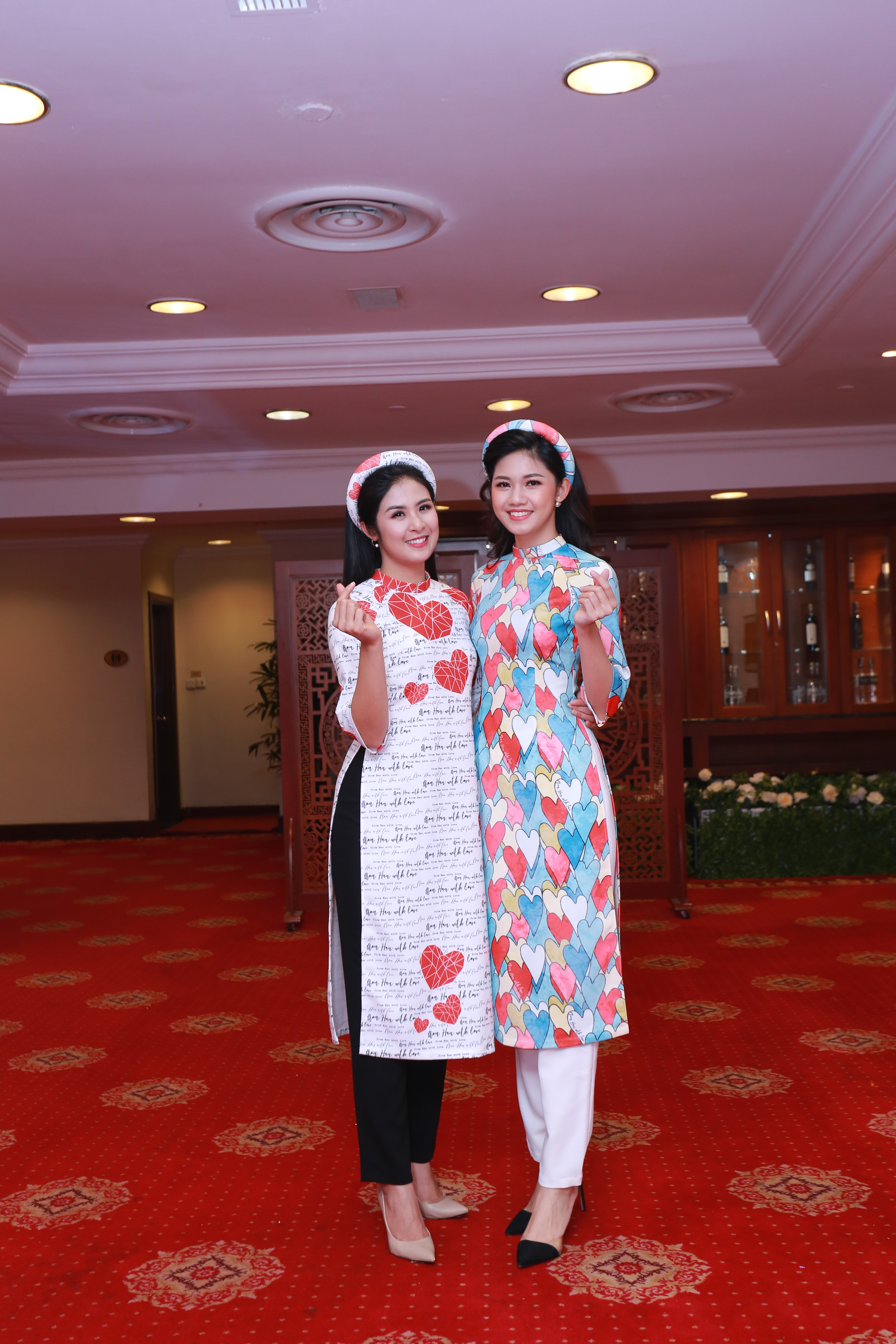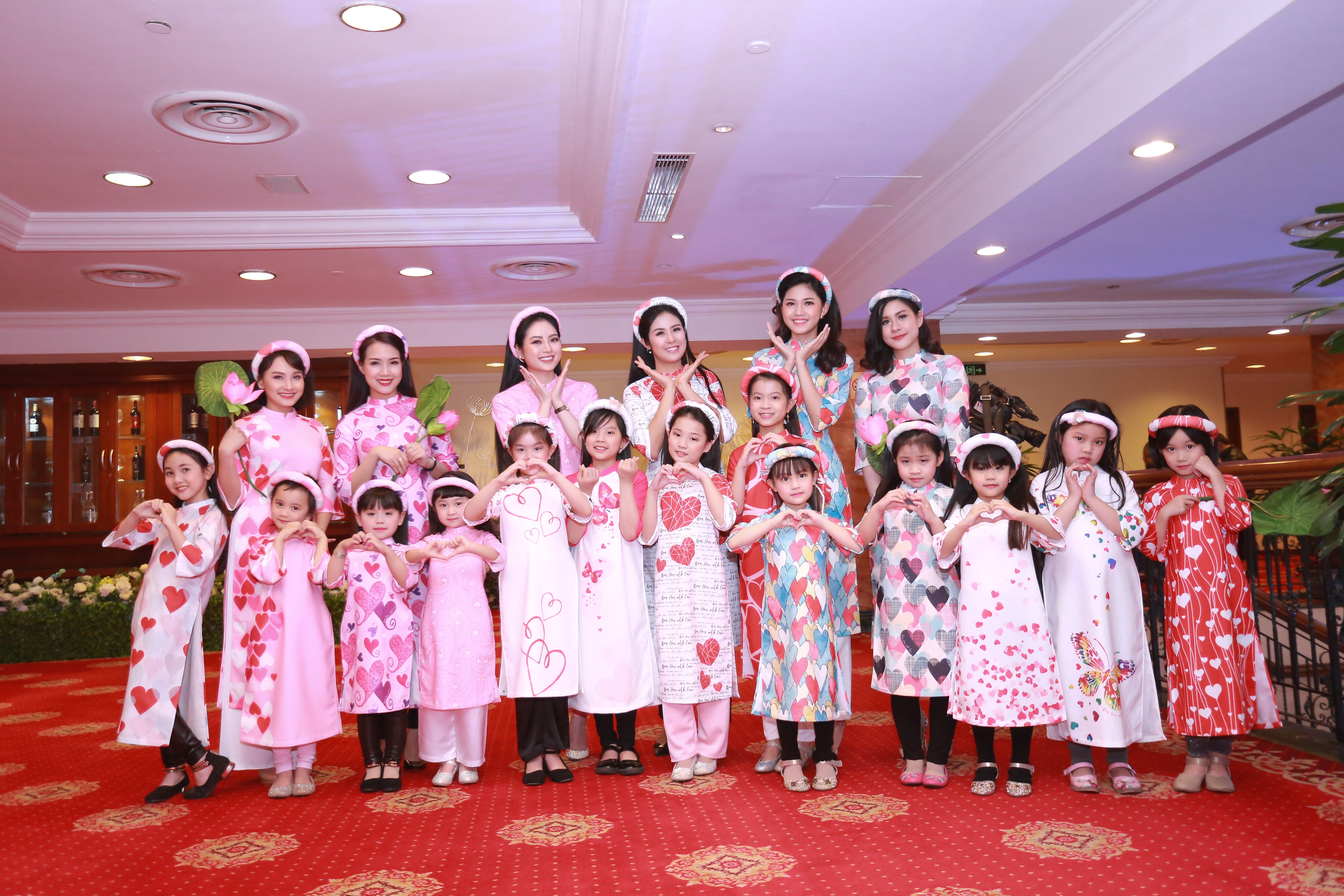 Diễn viên Lan Hương thể hiện tà áo dài màu hồng nhẹ nhàng in họa tiết trái tim.