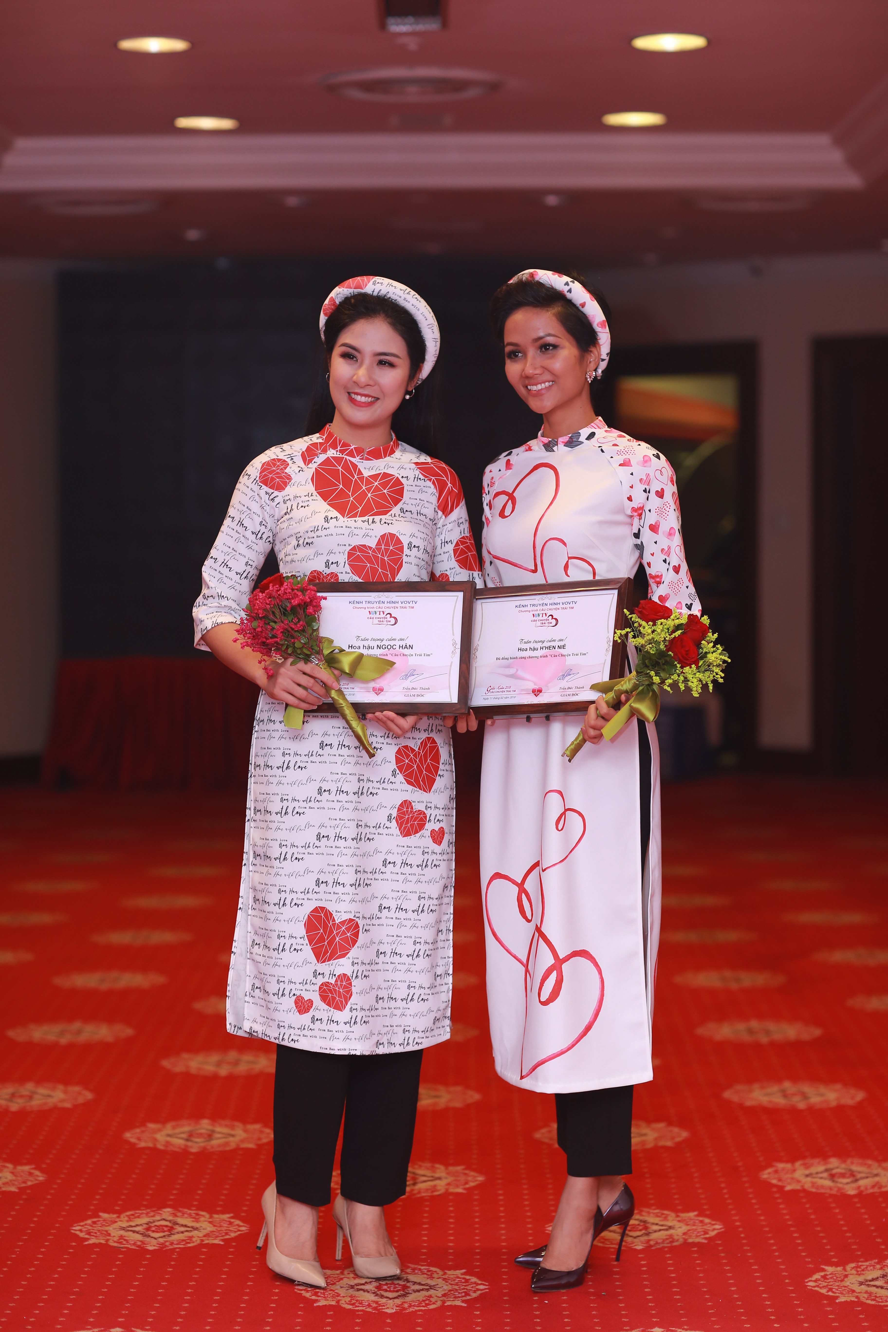 Bộ sưu tập áo dài “Trái tim yêu thương” được Ngọc Hân thực hiện gấp rút trong thời điểm bận rộn với những dự án cuối năm. Hoa hậu tiết lộ, cô lấy cảm hứng sáng tạo cho các mẫu áo dài từ chính những câu chuyện của chương trình. Trên nền chất liệu gấm thun cao cấp, những họa tiết hình trái tim với sắc màu rực rỡ tượng trưng cho sự may mắn, tốt đẹp.