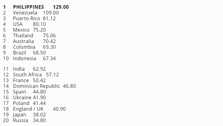 Trong khi đó Philippines đang ở vị trí dẫn đầu, “vượt mặt” Venezuela khi giành được số điểm là 129. “Cường quốc hoa hậu” xếp vị trí thứ 2 với 109 điểm. Puerto Rico đứng ở vị trí thứ 3, tăng 1 hạng so với thời gian trước đó nhưng vẫn còn cách Philippines và Venezuela một khoảng cách khá xa. Các quốc gia còn lại trong top 10 theo thứ tự là: Mỹ, Mexico, Thái Lan, Australia, Colombia, Brazil và Indonesia.