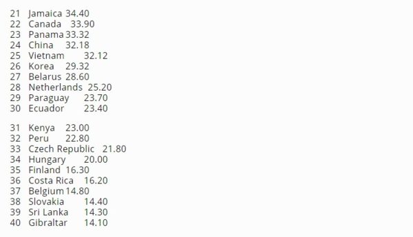 Theo đó, Việt Nam xếp thứ 25 với số điểm 32,12, tăng 2 bậc so với năm 2017.
