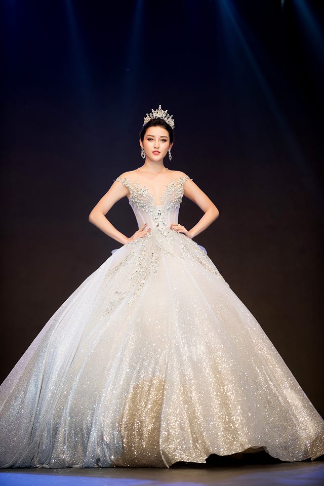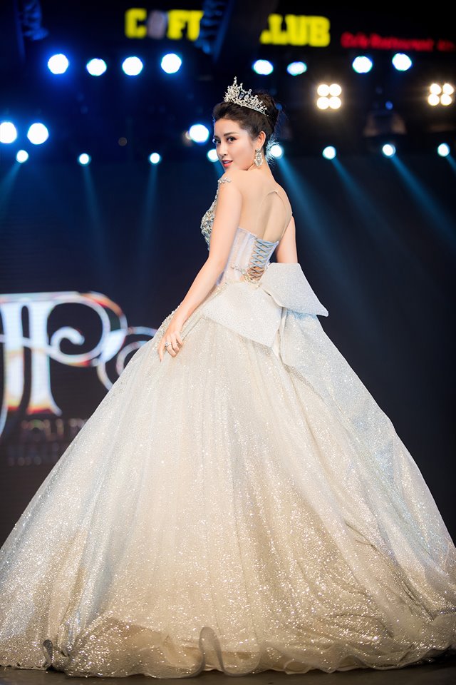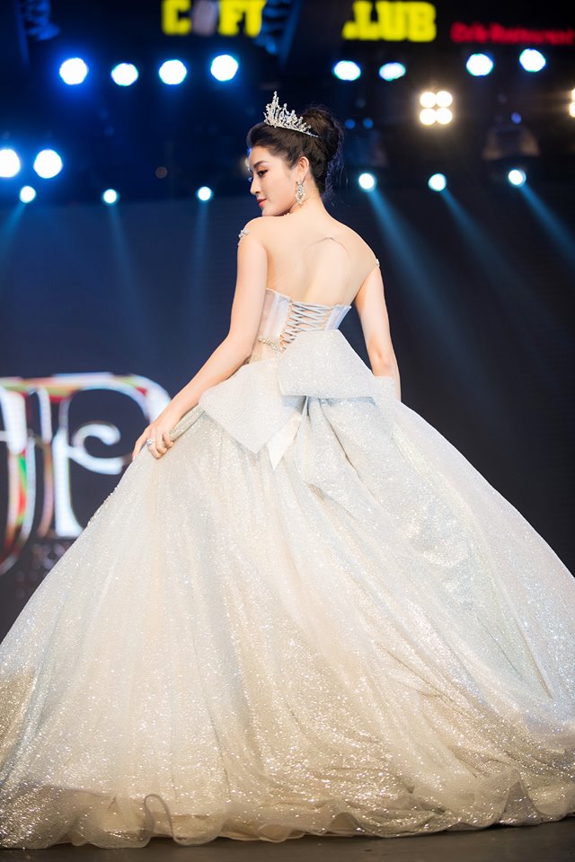 Bộ váy với điểm nhấn là chiếc nơ to bản ở phía sau lưng. Kết hợp cùng phụ kiện đính đá lấp lánh và chiếc vương miện, Huyền My lộng lẫy như nàng công chúa.