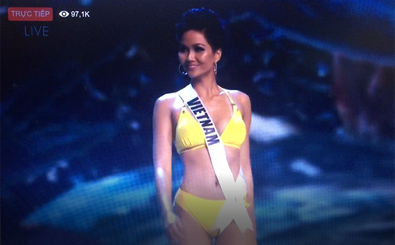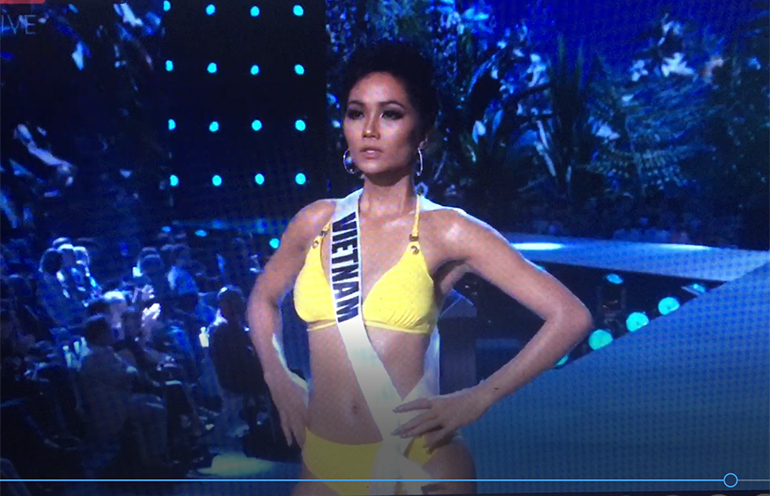 Đêm nay, H'Hen Niê đã chính thức bước vào vòng thi bán kết Miss Universe 2018. Mới đây, cô đã bước vào phần thi trang phục áo tắm. Đọ dáng cùng dàn mỹ nhân các nước, chân dài gốc Ê-Đê chẳng chút thua kém, cô nàng đánh hông, cười thật tươi “chặt chém” trên sân khấu.