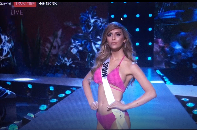 Đại diện Tây Ban Nha, thí sinh chuyển giới duy nhất của cuộc thi có hình thể khá mỏng.