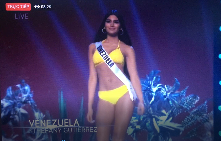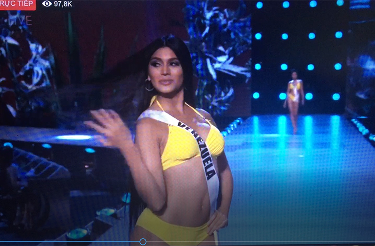 Đại diện cường quốc sắc đẹp Venezuela nổi bật với mái tóc dài cùng cách di chuyển uyển chuyển.