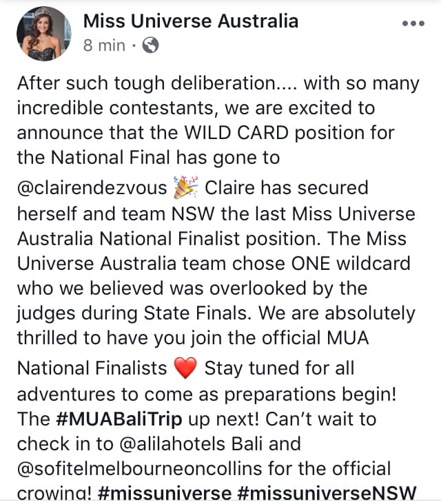 Thông tin được tổ chức Miss Universe Australia đăng tải trên fanpage.