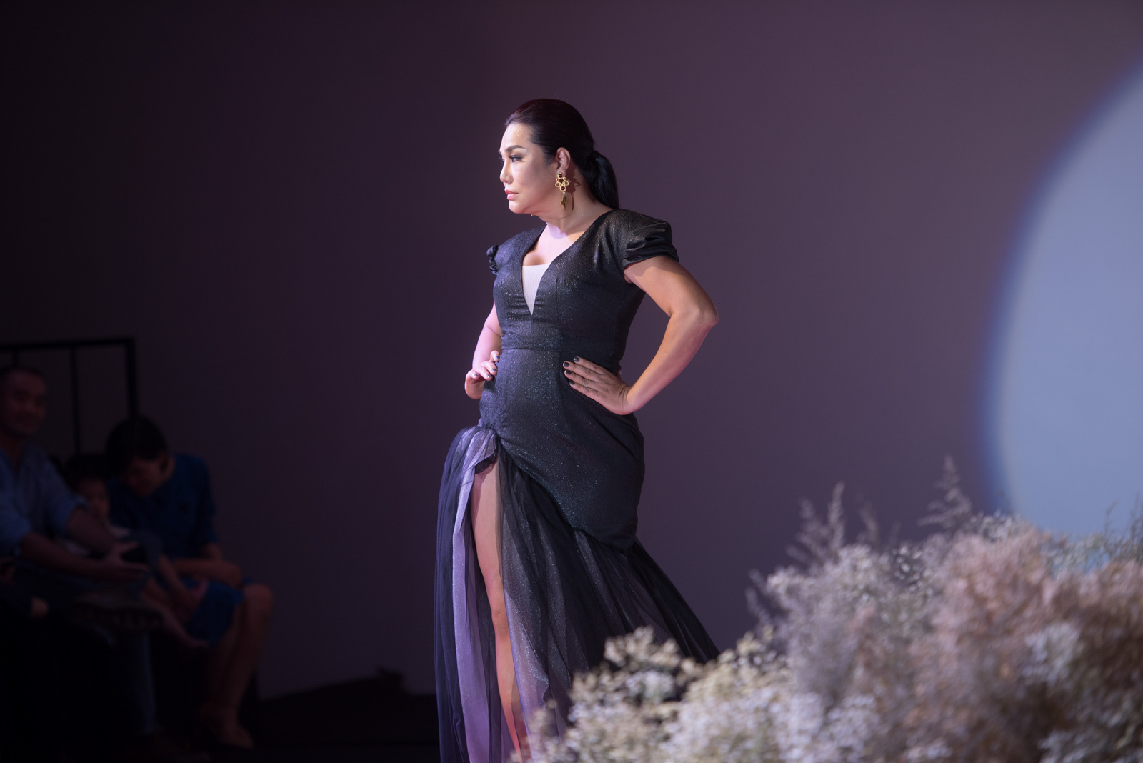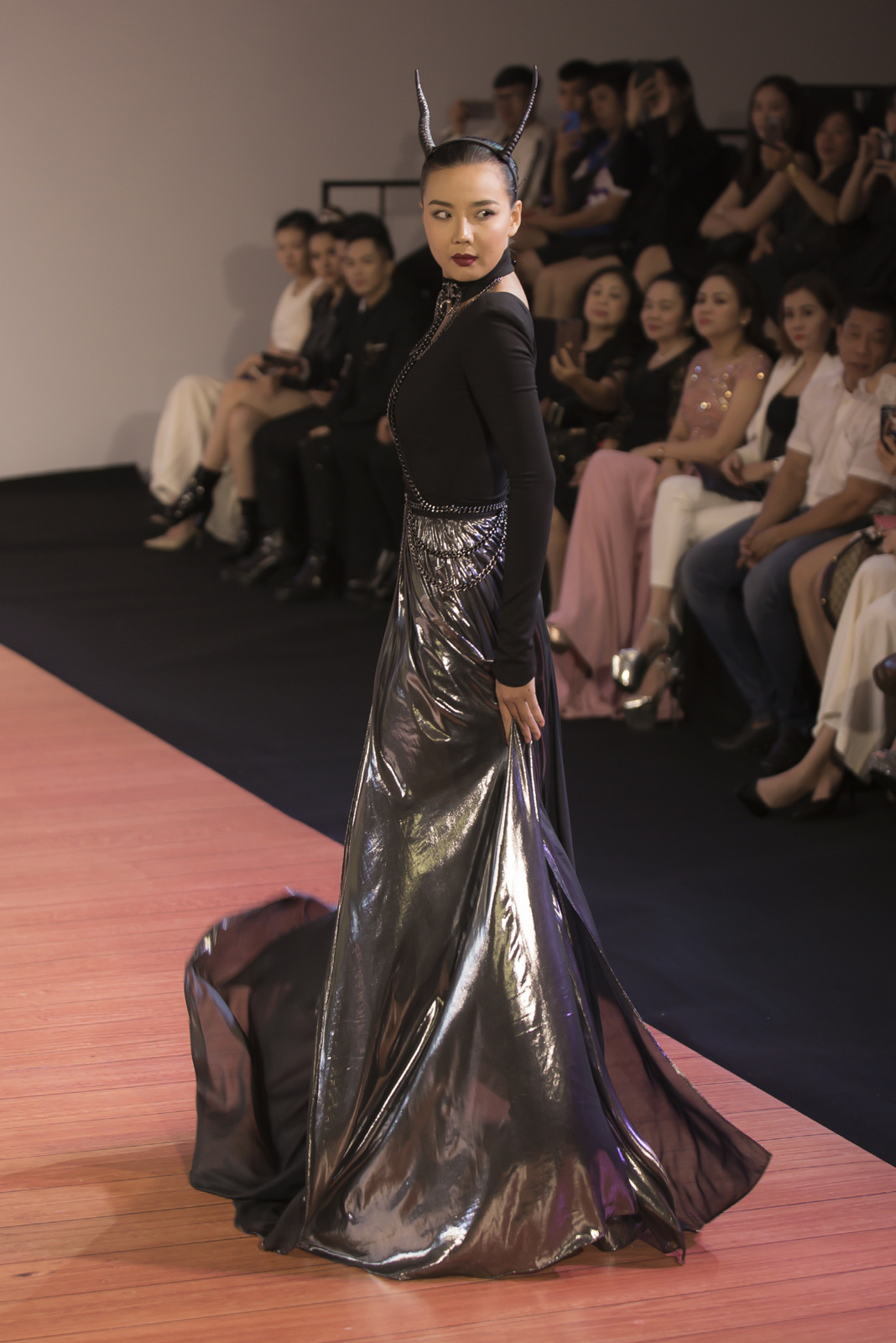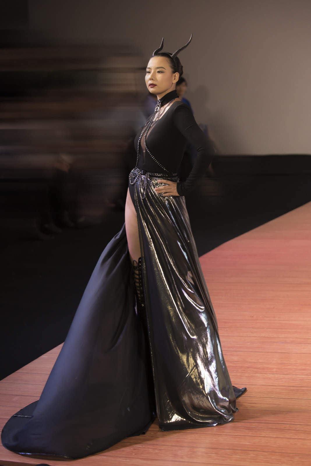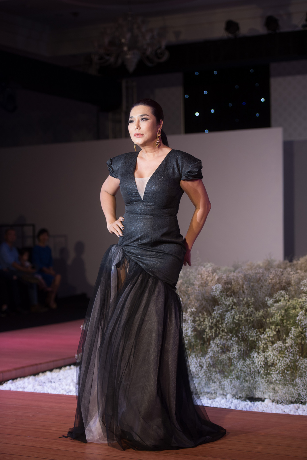 Đường xẻ ngực, cắt cao làm tôn được hết nét đẹp người phụ nữ. Hiếm hoi xuất hiện trên sàn catwalk, mỹ nhân chuyển giới đầu tiên của Việt Nam vẫn hoàn thành thật tốt phần trình diễn của mình.
