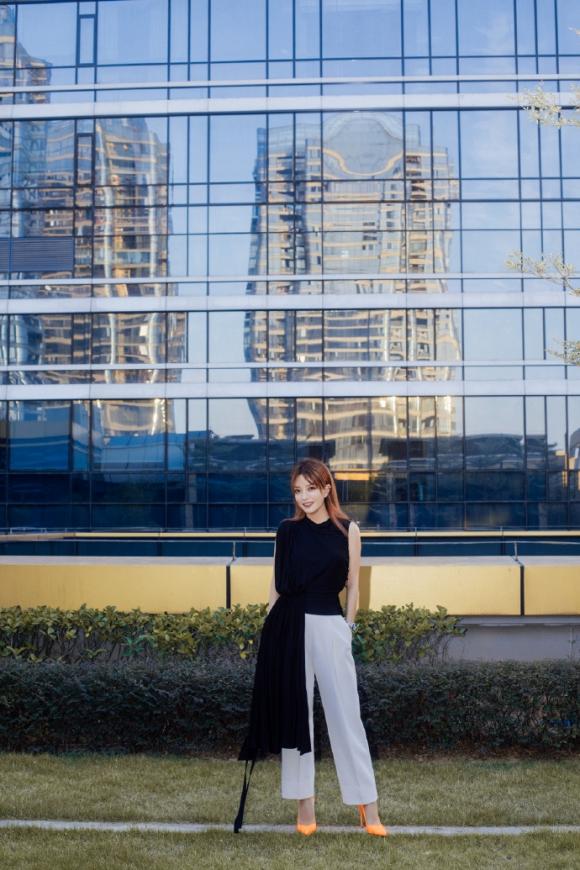 Triệu Vy chọn cho mình set đồ đen-trắng tinh tế với áo vạt dài mix cùng quần culottes lửng trắng tô điểm cùng đôi cao gót màu cam neon nổi bật