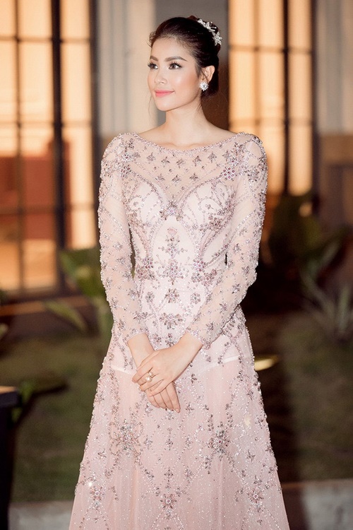 Trong sự kiện gần đây nhất, Phạm Hương tiếp tục hóa thân thành nàng công chúa trong thiết kế váy đầm dạ hội được đính kết từ rất nhiều hạt sequins lấp lánh.