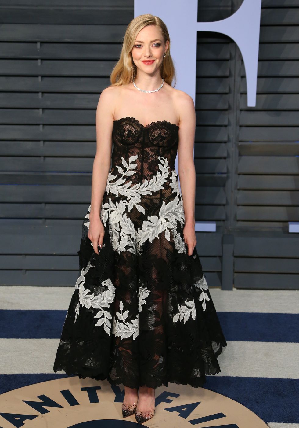 Vẻ ngoài của Amanda Seyfried khá luộm thuộm 'nhờ' chiếc đầm đen mỏng tang với họa tiết có màu đối lập.