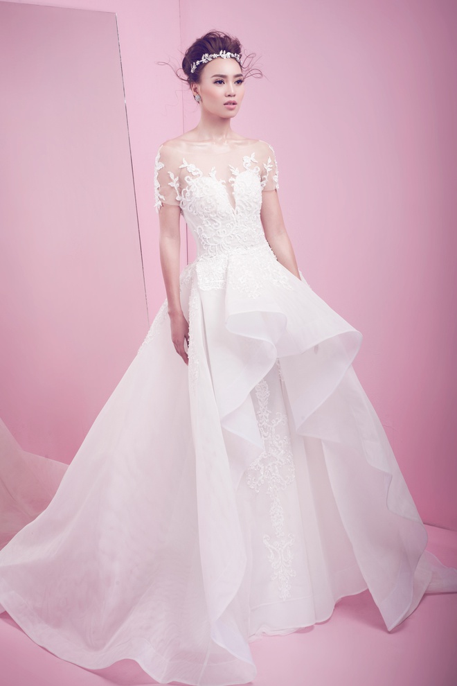 Khoác lên mình thiết kế bềnh bồng của NTK Lê Thanh Hoà, Ninh Dương Lan Ngọc trông vô cùng xinh đẹp. Để hoàn thiện hình tượng cô dâu, người đẹp phối thêm phụ kiện nơ bản to cài tóc, mang hoa tai bản lớn cùng lối trang điểm nhẹ nhàng cực kỳ phù hợp.