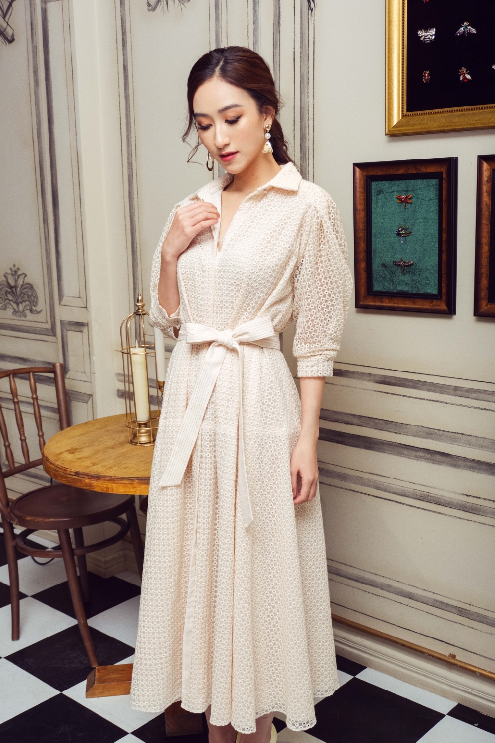 Phom dáng váy xòe đem đến nét thoải mái. Ngoài công sở, các nàng còn có thể ứng dụng vào những buổi đi chơi, tiệc nhẹ.