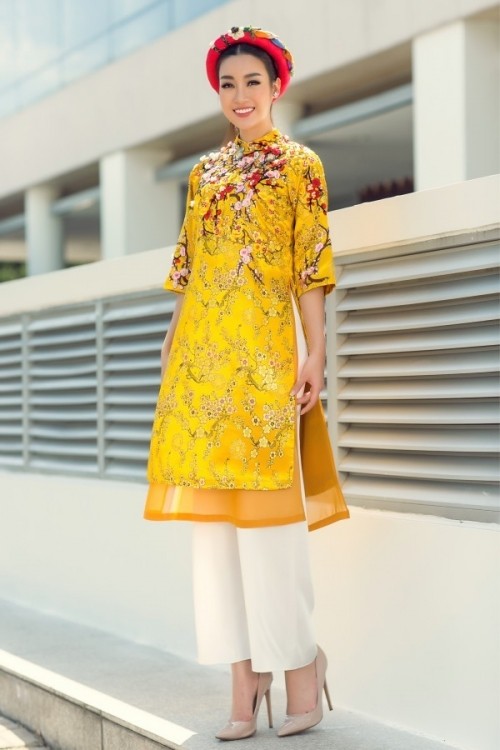 Đỗ Mỹ Linh cũng lựa chọn áo dài sắc vàng để khoe vẻ đẹp mong manh, trong sáng của mình.