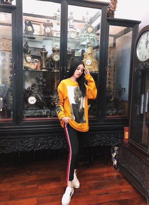Lẫn Jolie Nguyễn đều mê mẩn cùng một chiếc áo sweater màu vàng in họa tiết.