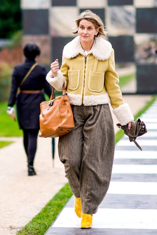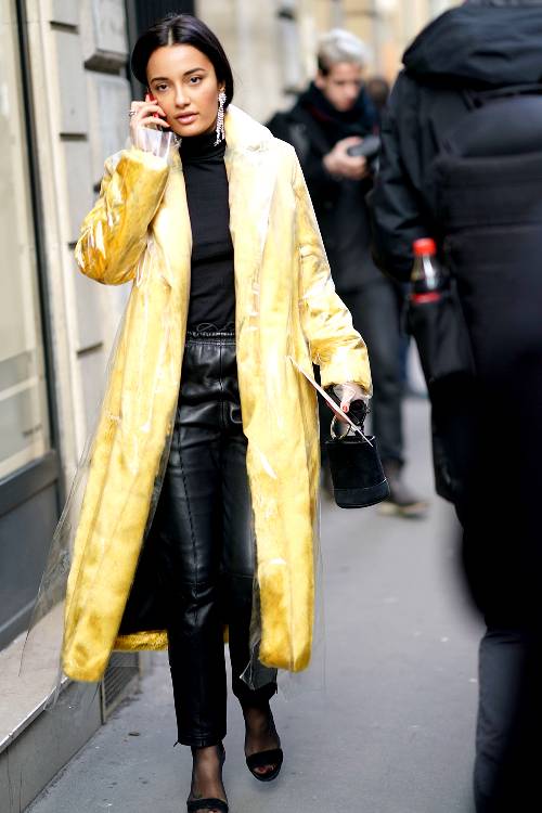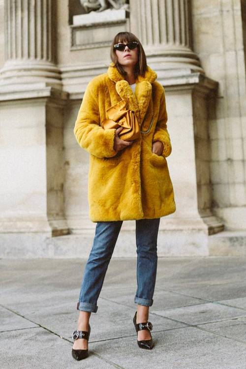 Lông luôn là loại chất liệu yêu thích của những quý cô sang chảnh. Với chiếc áo khoác màu vàng mustard này, cô nàng này khiến người đối diện không thể rời mắt.