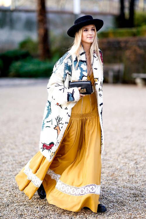 Một chiếc váy dài phong cách boho đi cùng áo khoác họa tiết khác ngoài là bạn đã đủ nổi bật.