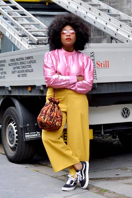 Cô bạn này có cách phối hai màu hồng và vàng đất khá hay. Khác biệt về bề mặt chất liệu bóng, thô cũng là điểm cộng cho set đồ này.
