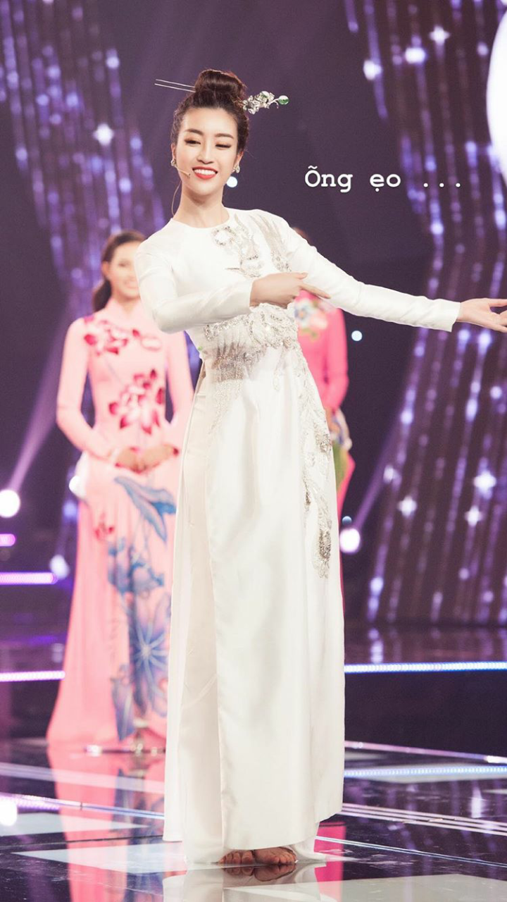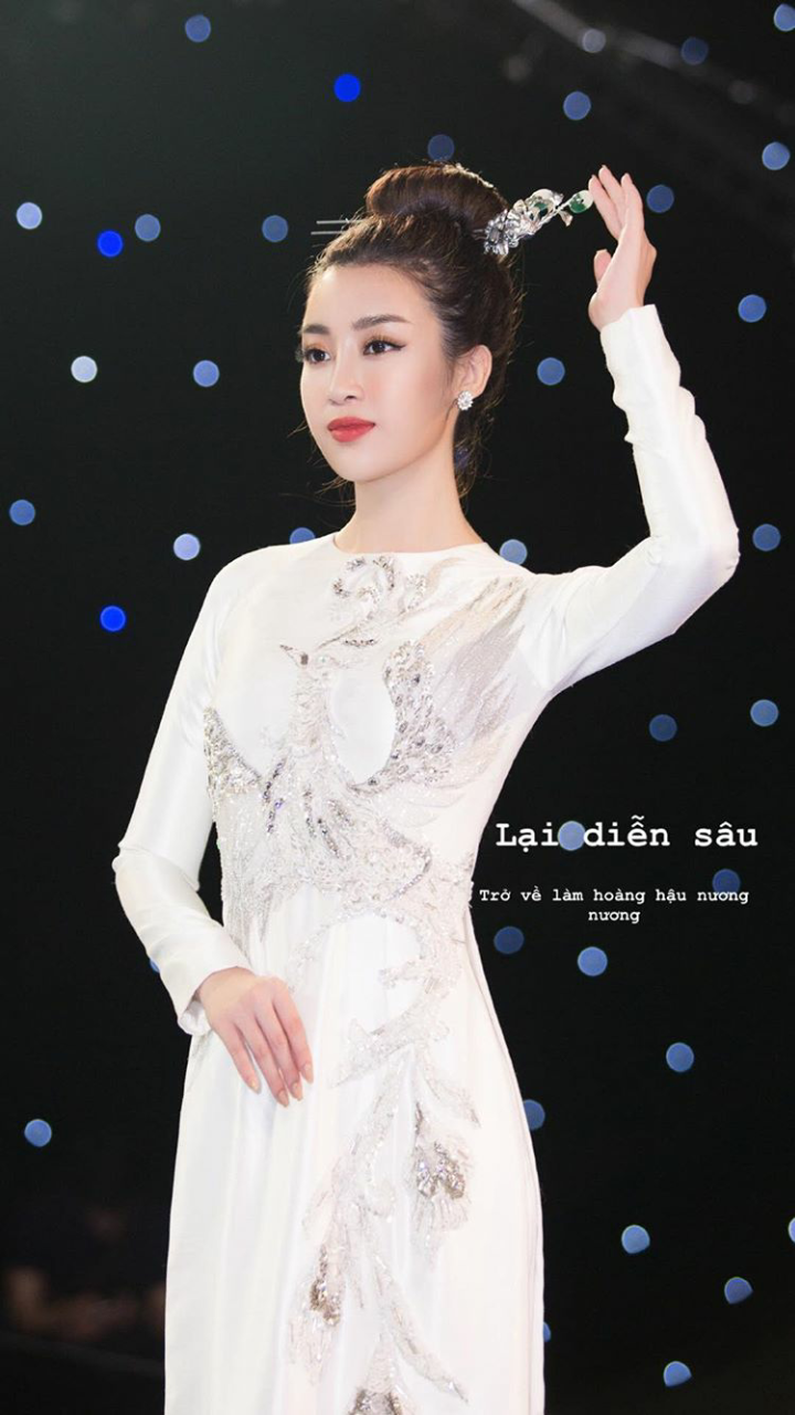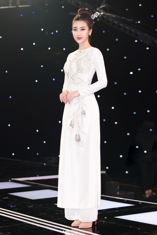 Trong đêm thi, Hoa hậu Việt Nam 2016 xuất hiện với trang phục áo dài trắng truyền thống với họa tiết chim phượng hoàng bay bổng toát lên sự sang trọng, quý phái. Lối trang điểm nhẹ nhàng nhưng vẫn giúp cô nổi bật và xinh đẹp hết phần người khác.