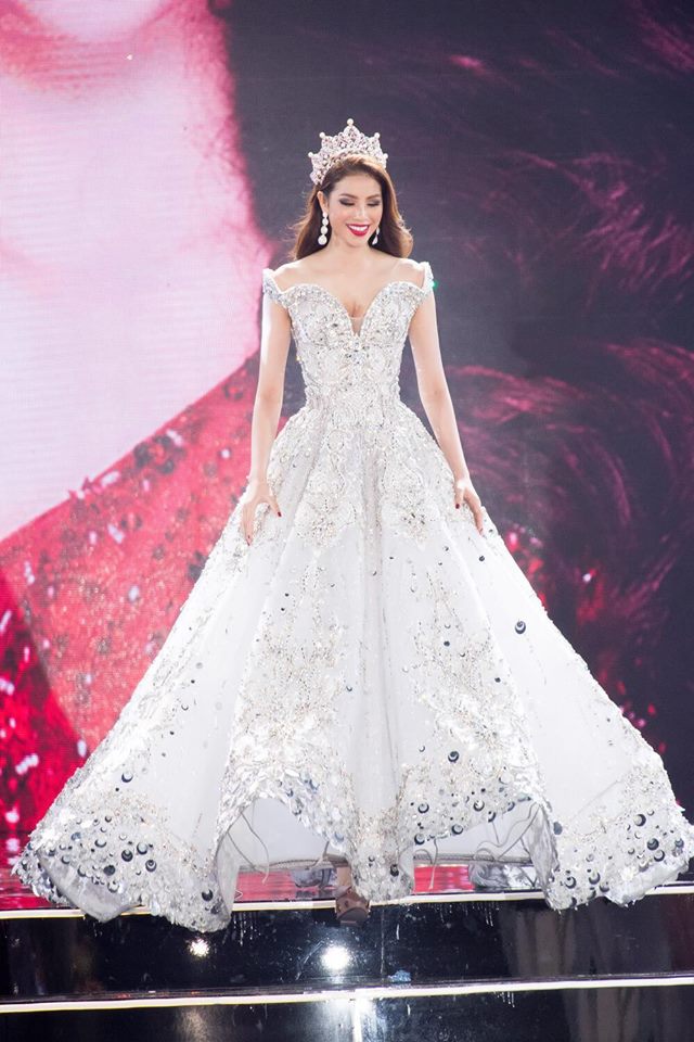 Kết thúc nhiệm kỳ của mình, Hoa hậu Phạm Hương xuất hiện với một bộ váy lộng lẫy như nữ hoàng bước ra từ truyện cổ tích. Được biết, đây là thiết kế của NTK Đỗ Long “đo ni đóng giày” dành riêng cho Hoa hậu Phạm Hương, để cô có thể tỏa sáng trong khoảnh khắc trọng đại.