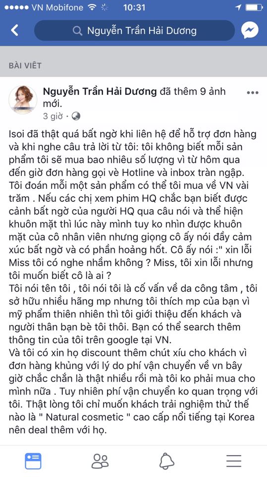 Trên trang cá nhân của mình, Hoa Hậu Hải Dương chia sẻ: “Isoi đã quá bất ngờ khi tôi liên hệ để hỗ trợ đơn hàng và khi nghe câu trả lời tôi không biết mỗi sản phẩm sẽ mua bao nhiêu vì từ hôm qua đến giờ đơn hàng gọi về Hotline và inbox tràn ngập. Tôi đoán mỗi một sản phẩm có thể tôi mua về Việt Nam với số lượng vài trăm. Sau khi nghe tôi chia sẻ, giọng cô nhân viên đầy cảm xúc bất ngờ và có phần hoảng hốt. Cô ấy nói:”Xin lỗi chị tôi có nghe nhầm không? Chị, tôi xin lỗi nhưng tôi muốn biết chị là ai?. Đơn giản, tôi chỉ muốn mang những gì tốt nhất về Việt Nam cho khách trải nghiệm.”