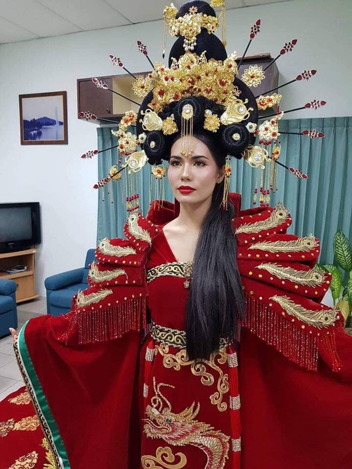Tà áo dài cả thước cộng thêm quả đầu không thể nào nặng hơn được nữa đã giúp cựu Hoa hậu hóa thân thành công hình ảnh một mệnh phụ Phu nhân hay một Hoàng hậu mẫu nghi thiên hạ đầy quyền lực.