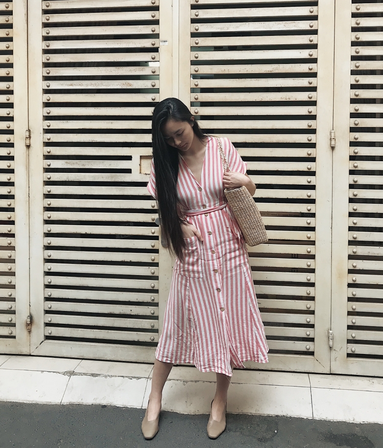 combo mang đậm màu sắc mùa hè gồm váy dài qua gối mix cùng túi cói là sự lựa chọn của hot girl Helly Tống khi xuống phố.