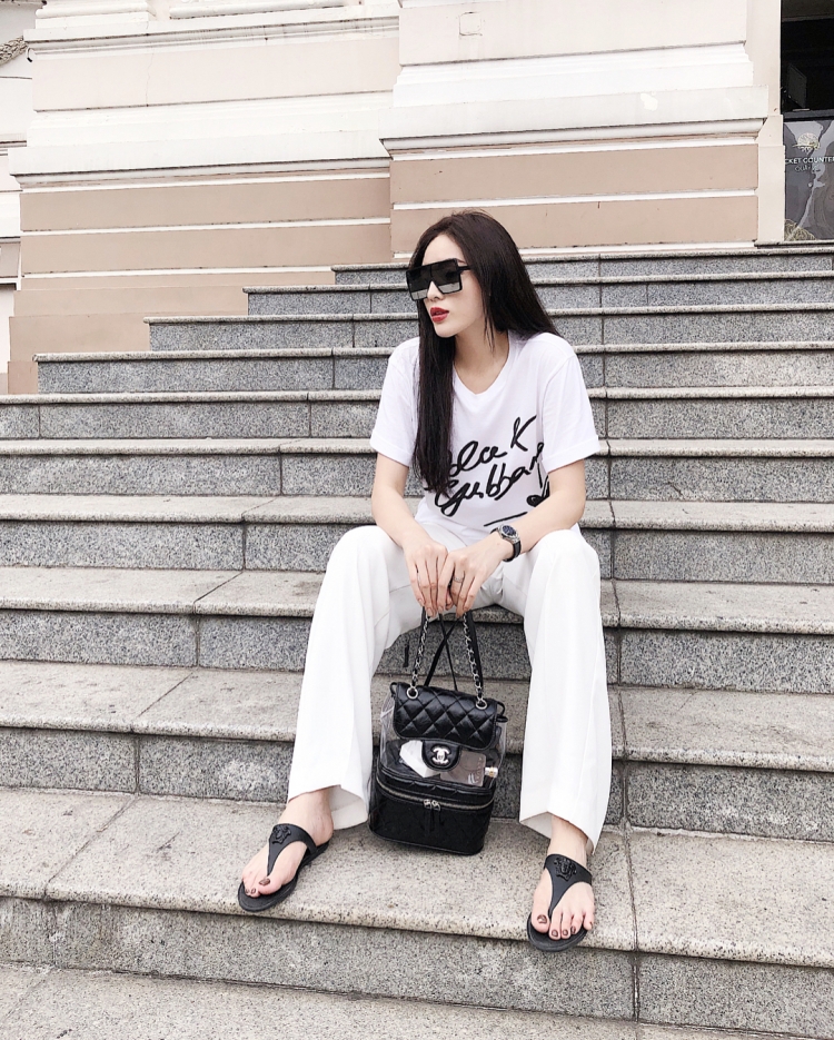 Dù đang bận rộn tham gia chương trình truyền hình thực tế “Khi đàn ông mang bầu”, Kỳ Duyên vẫn không quên ăn mặc cực chất. Nàng hậu lựa chọn set đồ thời thượng “đắt xắt ra miếng” toàn tông trắng khi xuống phố, gồm áo phông Dolce & Gabbana, dép Versace, túi Chanel và kính mát Yves Saint Laurent.