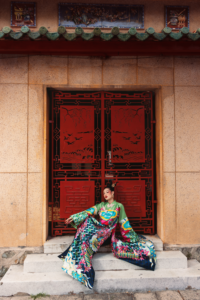 Ở concept đầu tiên, Hoa hậu Khánh Vân khoe dáng tại công trình kiến trúc cổ, hoạ tiết trên áo dài hài hoà với hoạ tiết của những bức phù điêu trên vách và mái ngói, tạo sự kết nối mang hàm ý bảo tồn, lưu giữ những nét đẹp truyền thống. Với khung cảnh này, Hoa hậu Khánh Vân chọn cách tạo dáng đơn giản, thể hiện hình ảnh cổ điển, duyên dáng của người phụ nữ Việt Nam từ bao đời nay.