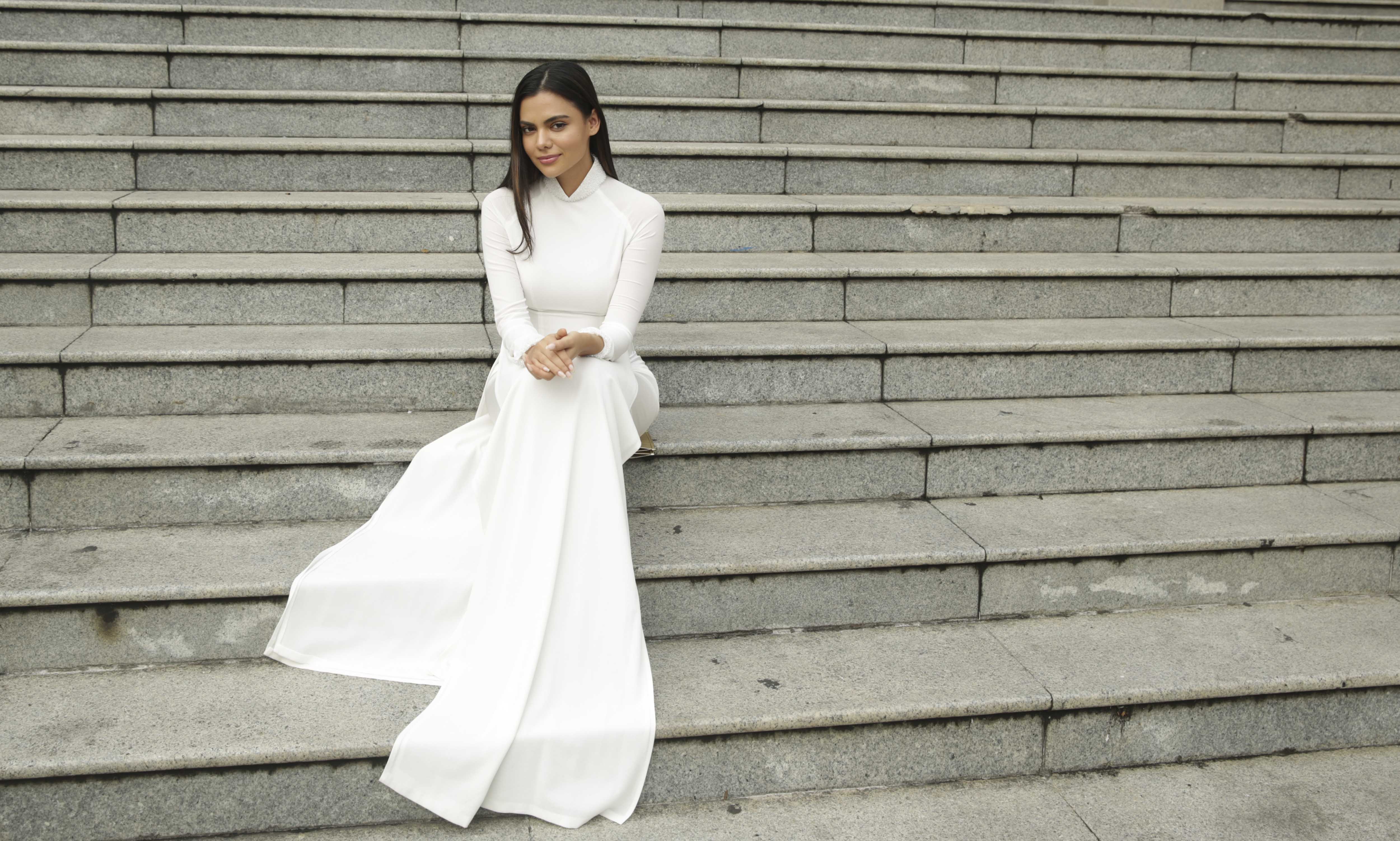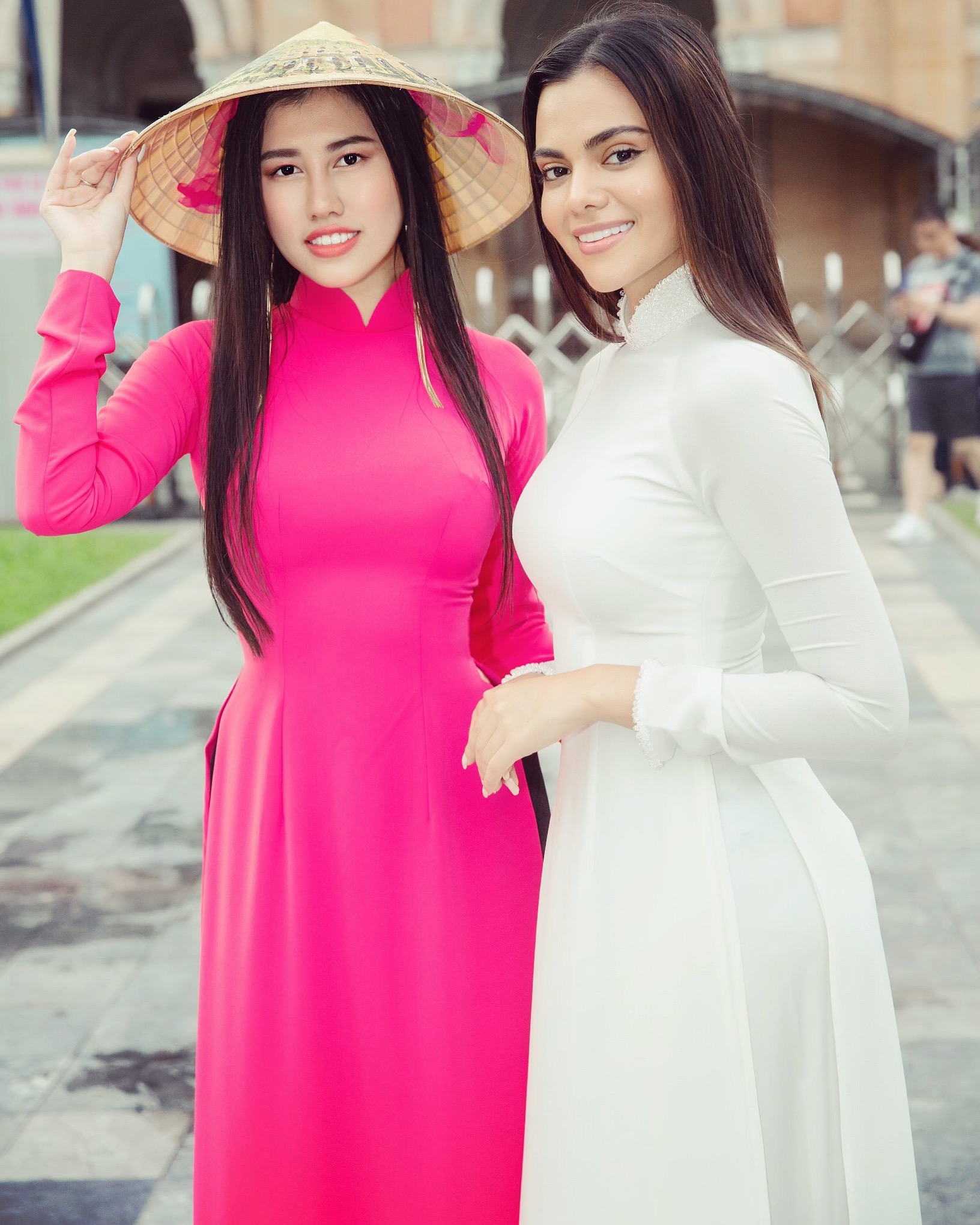 Hoa hậu Karen rất thích thú khi cùng Emily sải bước trong những tà áo dài,