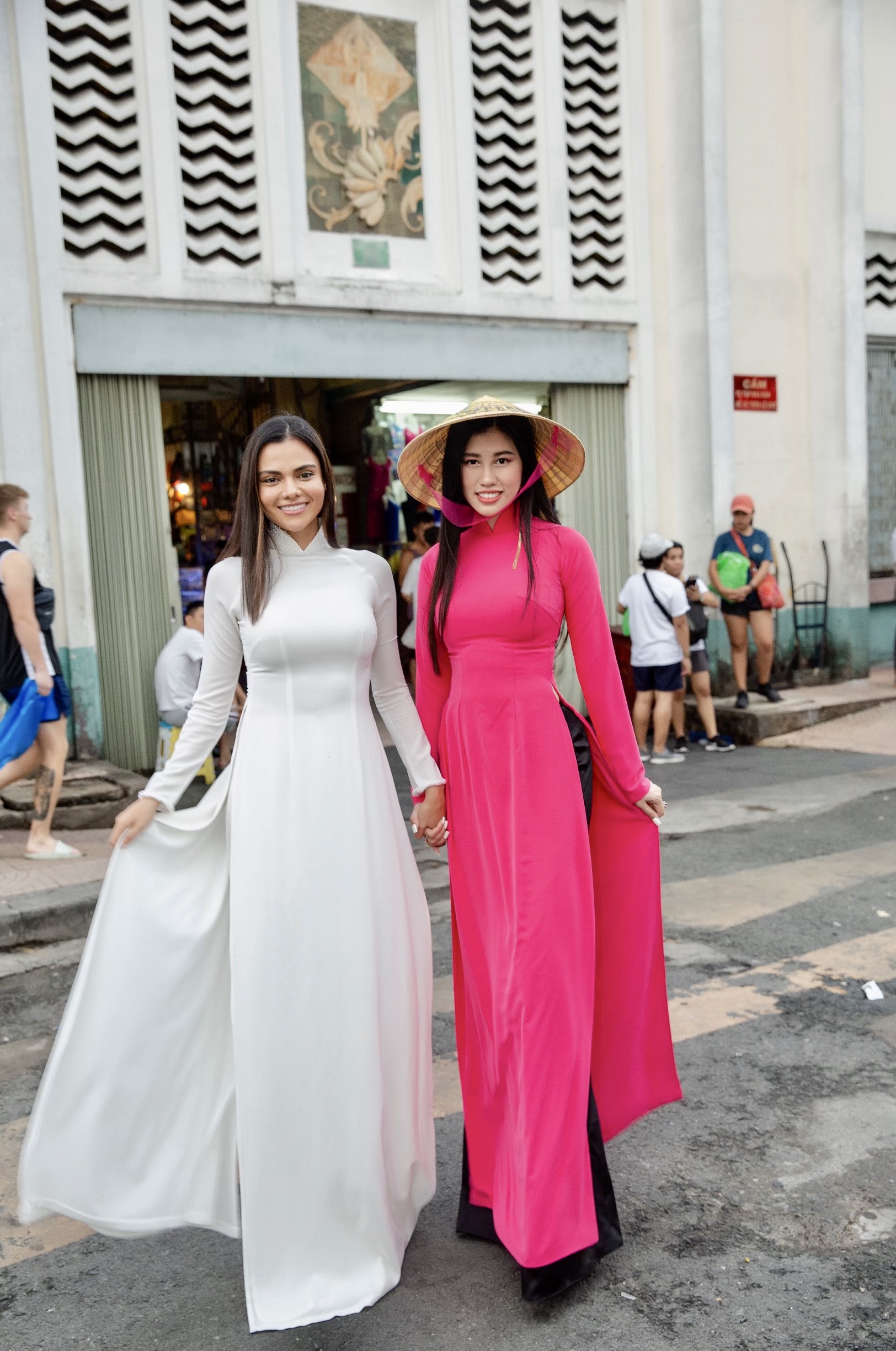 Nhiều người qua đường đều dừng lại ngắm nhìn nhan sắc của hai hoa hậu. Ai cũng tấm tắc khen hai người đẹp duyên dáng và tươi xinh.