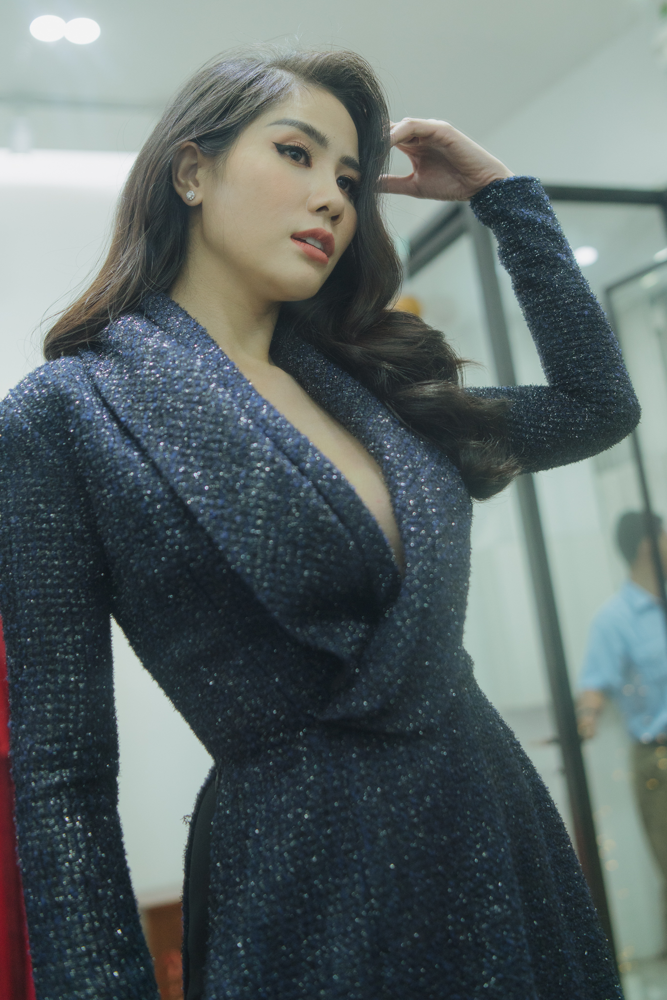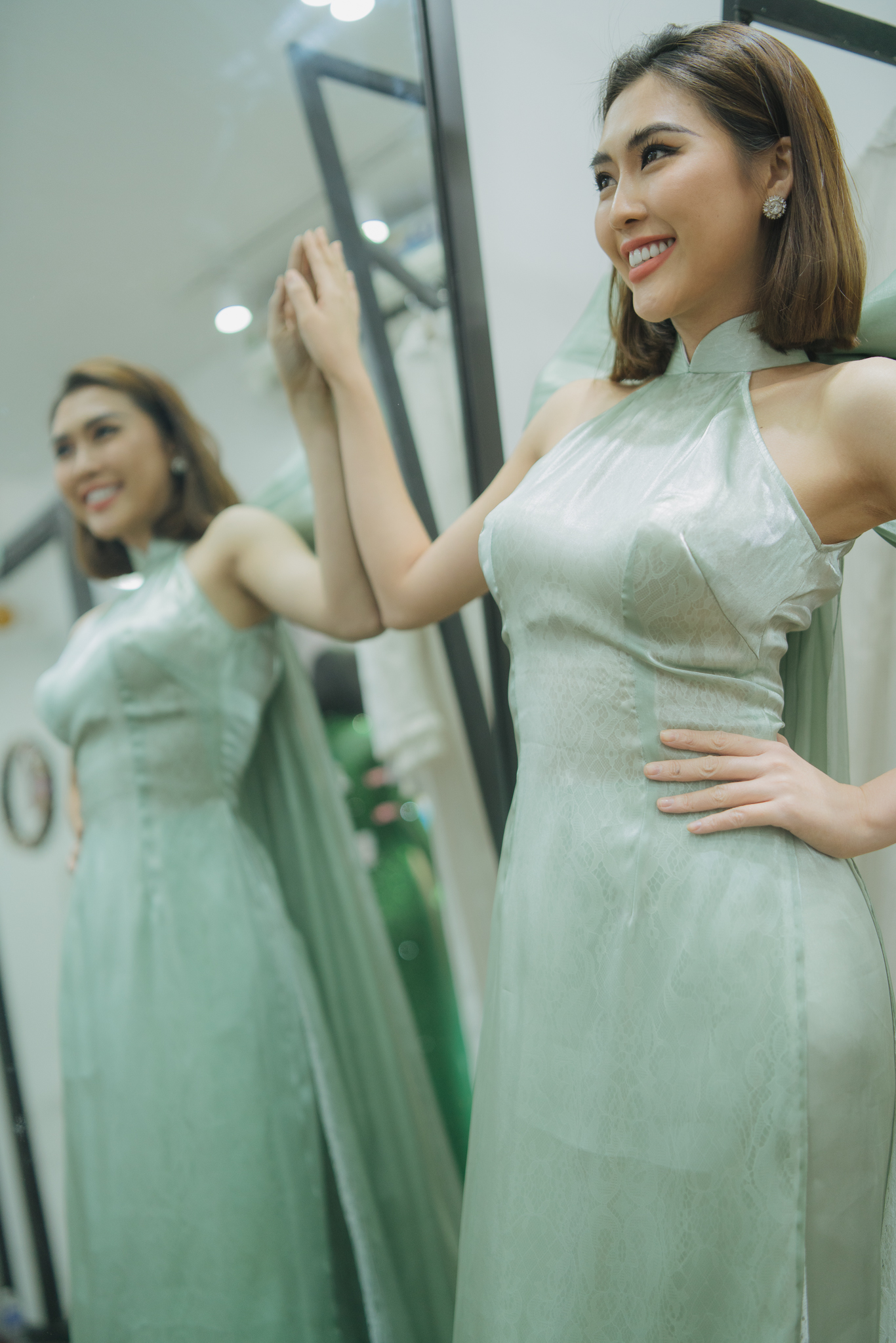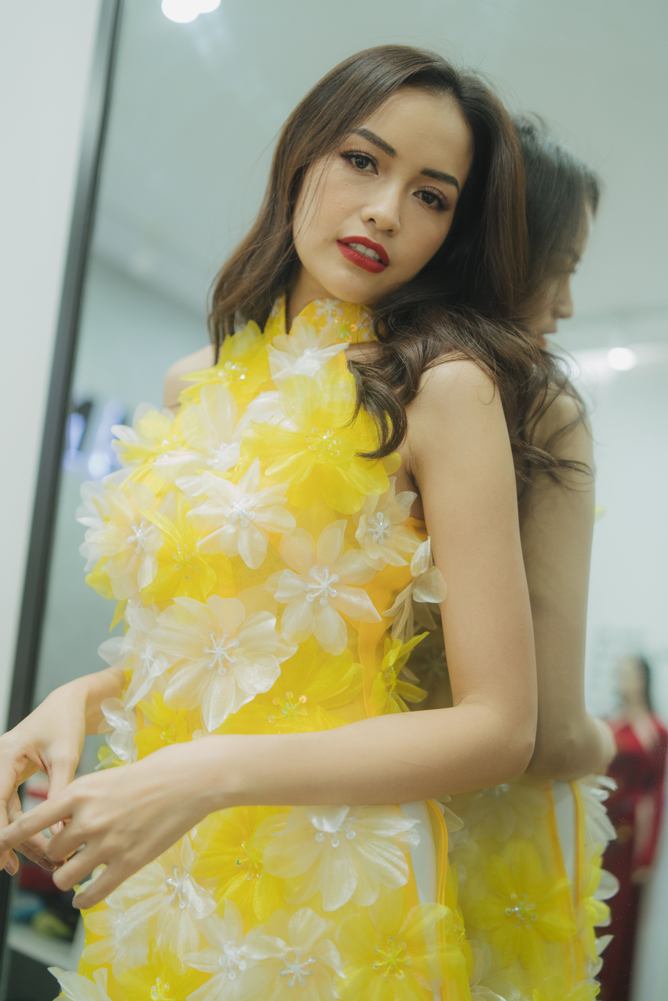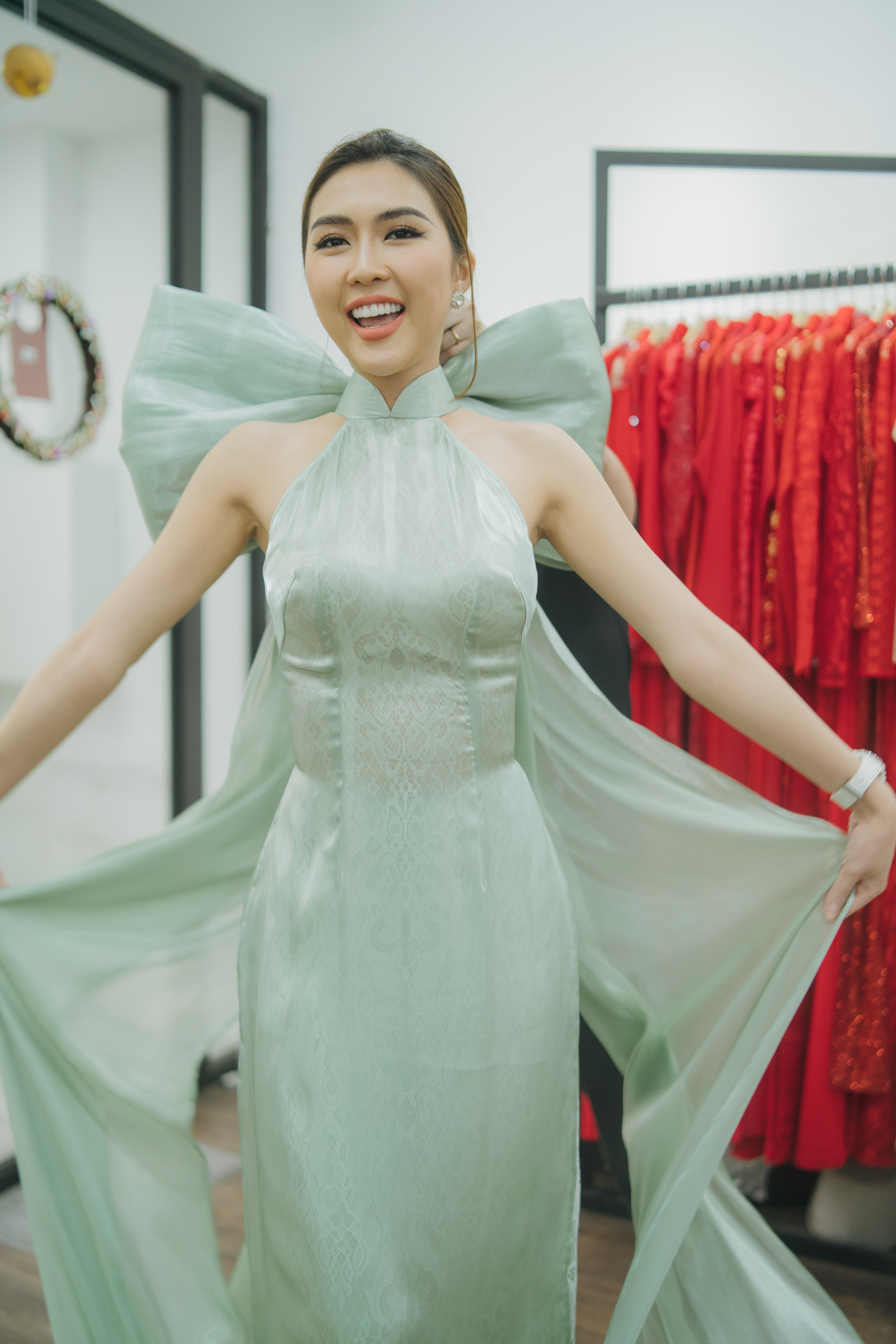 Tường Linh cũng đảm nhận vị trí quan trọng trong show diễn, cô nàng thích thú khi thử một thiết kế áo dài có phần nơ bản to.
