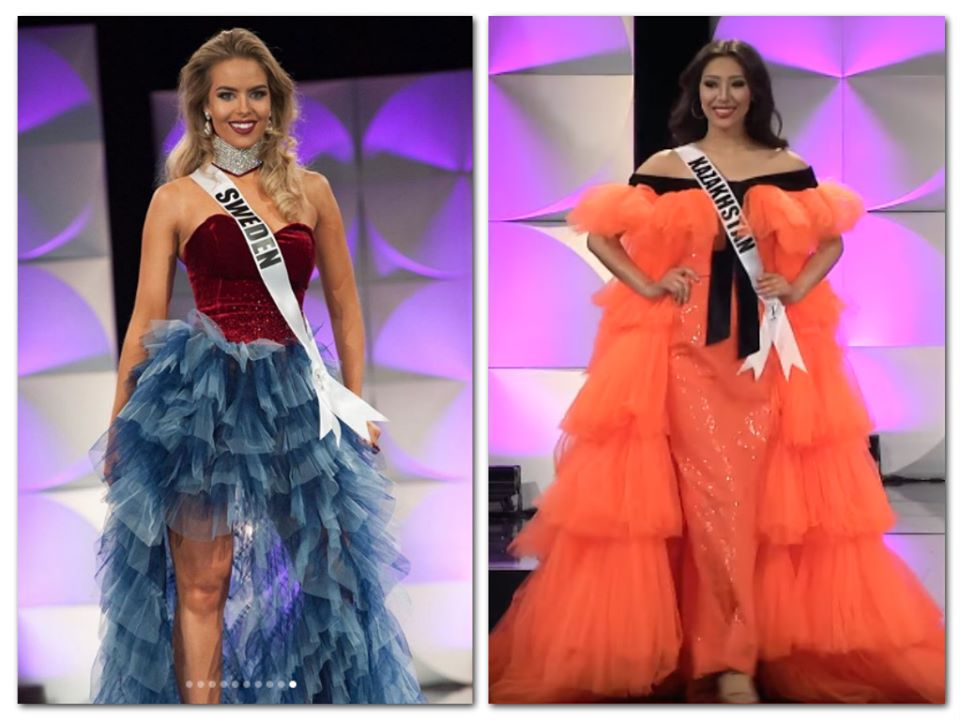 Hai bộ cánh của Hoa hậu Thụy điển và Kazakhstan bị fan xếp thuộc hàng thảm họa bật nhất của đêm bán kết Miss Universe 2019.