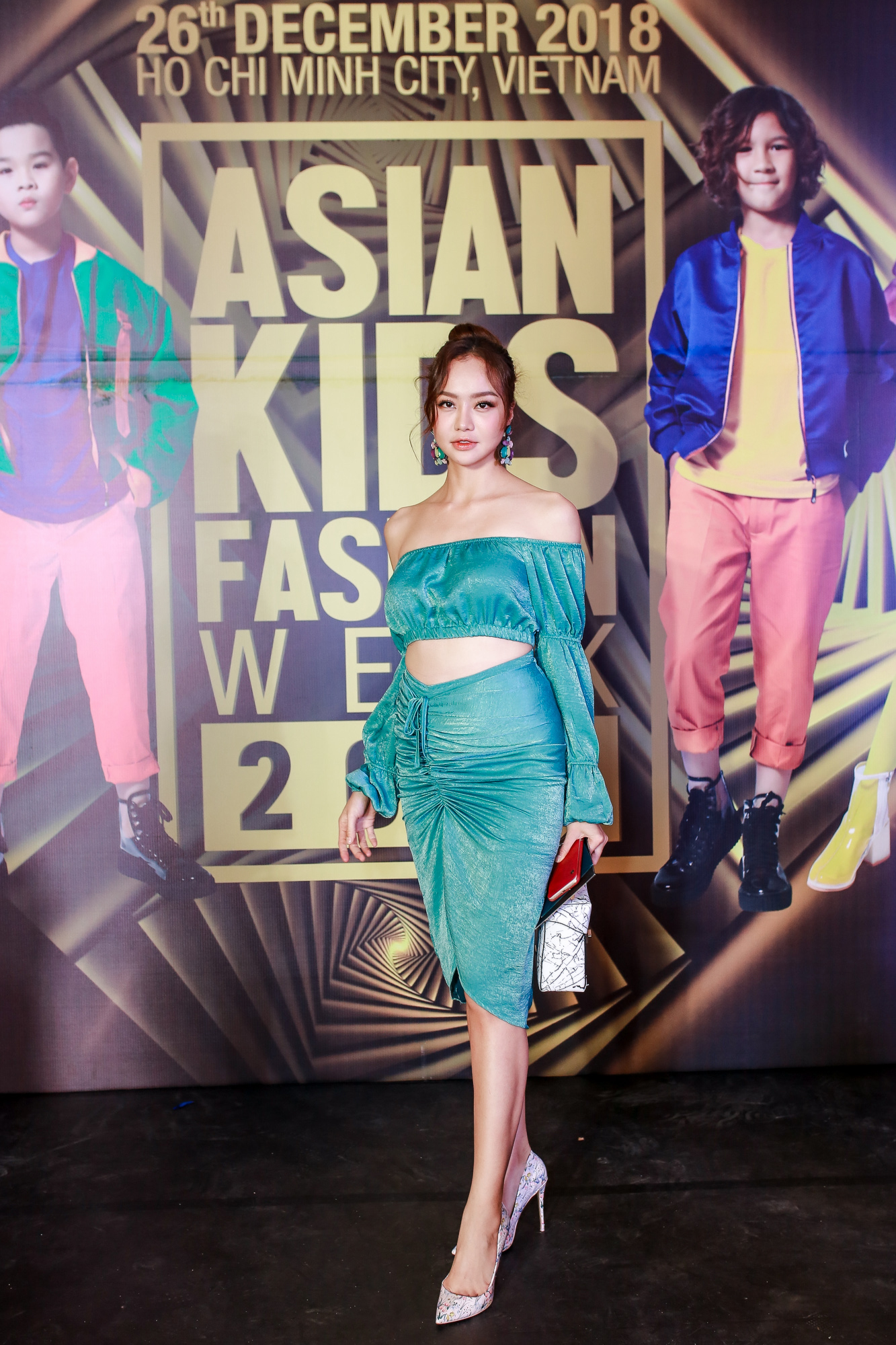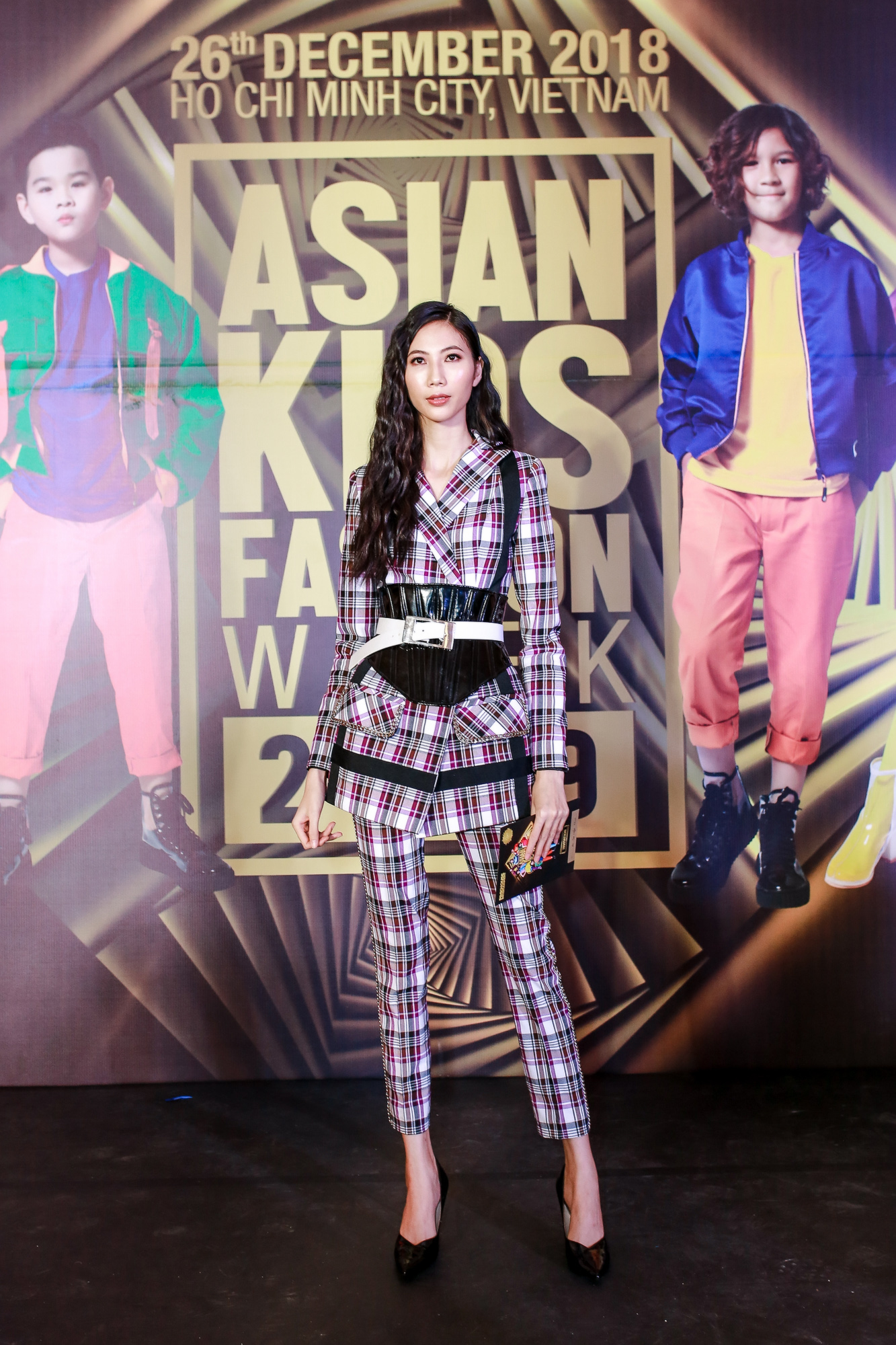 Người mẫu Cao Ngân chọn suit họa tiết kẻ ô phối thắt lưng cá tính. Lần đầu có mặt tại sự kiện thời trang dành cho trẻ em, chân dài tỏ ra thích thú và hy vọng sẽ được chứng kiến những màn trình diễn đặc sắc của các mẫu nhí trong và ngoài nước.